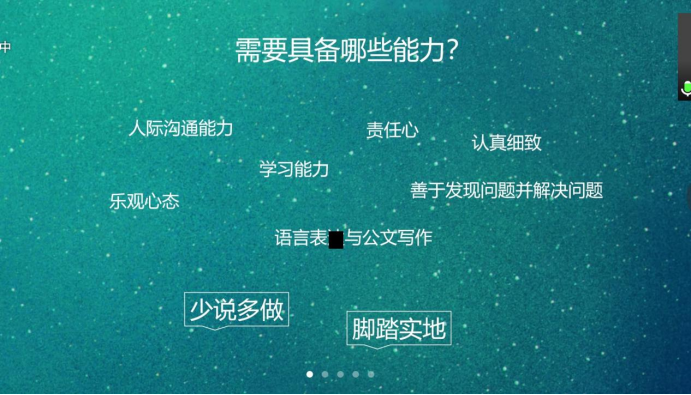 接下来,她为我们重点讲述了选调生的报考建议。例如,在讲述过程中,学姐就社会责任感和奉献精神具体谈到了她自身在街道基层的工作状况。其中就有在疫情反弹的当下每天早晨五点起床前往组织核酸检测,深入企业内部排查疫情安全隐患等辛苦的日常工作,很好地印证了她讲话的要点。