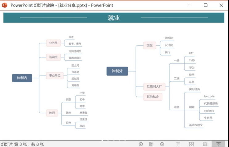 然后在就业方面,学长对体制内外的工作进行了分析。