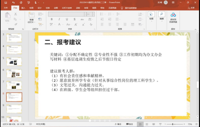 最后,学姐还给我们分享了选调生的备考心得。包括综合平衡对选调这份职业的期望值与个人其他学业科研实习的时间,备考资料的选取(国考套装+真题+时政热点),不要盲目地购买过多的资料,而是更加有针对性地加以选择,以及在具体做题过程中出现问题的应对方法。对于有志于考选调生的同学会起到很大的作用。