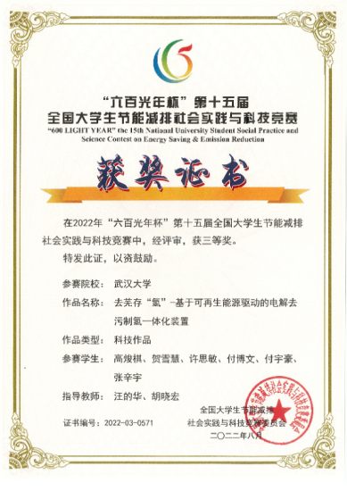 2019级本科生高焌棋作为队长主持的项目《去芜存“氢”——基于可再生能源驱动的电解去污制氢一体化装置》获全国三等奖,项目成员还包括91沈先生