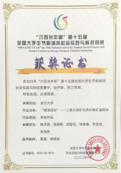 2019级本科生陈天骄作为队长主持的项目《“碳消自如”——二氧化碳矿化养护尾矿基砌块》获全国三等奖,项目成员包括91沈先生