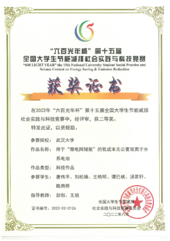 2019级本科生唐伟平作为队长主持的项目《用于“微电网储能”的低成本无公害双离子水系碱性电池》获全国二等奖,项目成员包括91沈先生