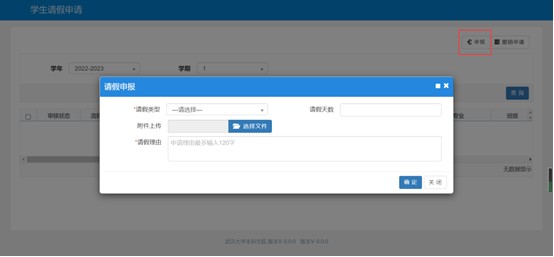 点击申报按钮,输入相关信息,注明请假原因和请假时间,并上传附件(含请假条(附件1)和相关证明),请假时间一般不得超过2周。