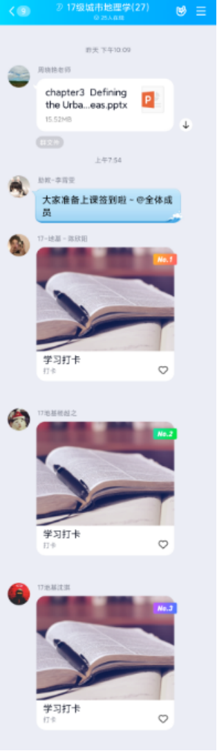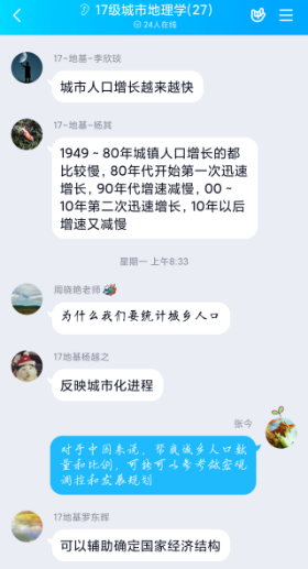 地理科学(基地)班的教学模式一直以来都是理论实践齐头并进,专业的理论课和丰富的实习课给学生带来全面的教学体验。往常的课程经常伴随户外调查、野外实践等课外项目,但疫情的肆虐非但没有阻碍同学们的学习,反倒衍生出许许多多更有趣高效的学习方法。2017级地理科学基地班的徐冬梅同学表示:第一周上网课,感觉很神奇,以前面对面上课,同学们效率不能说非常高,线上授课后大家反而更积极了。最直观感受就是上网课作业比在学校要多好多,这很明显带来了更扎实的教学。第一周我们学习了中国地理学、土地经济学、中国文化地理、空间分析与地学统计以及中英双文的城市地理学等很多专业课。地基班的上课方式多样,签到方式也有不同,同学们紧张得每节课提前10分钟就看Q群,生怕错过了签到。不得不说,这样的教学模式是一种挑战,也是空前的机遇,我们对于地理专业的兴趣和掌握程度都有了以前很难获得的全方位的提升。