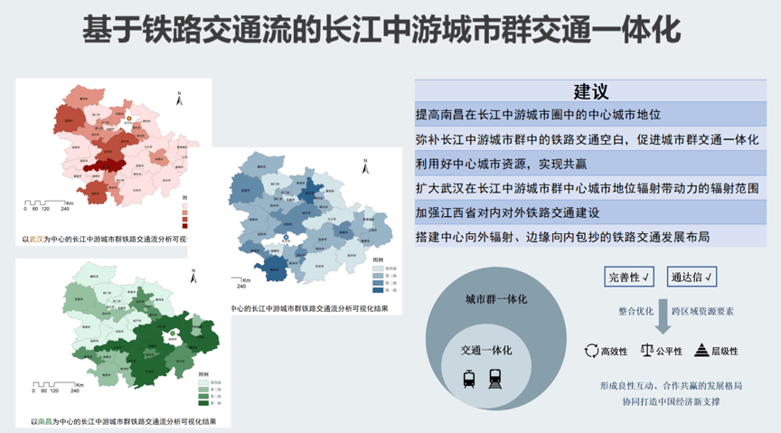 2018级本科生卢婉婷、阿衣尼格尔·阿斯卡尔二位同学组成,孔雪松老师担任指导老师,作品以交通治理为背景,将铁路交通作为着眼点,分析以武汉、长沙和南昌为中心的长江中游城市群铁路交通问题,基于铁路交通对长江中游城市群的交通一体化提出合理化建议及治理的新思路、新方向。