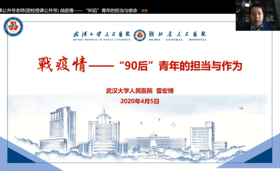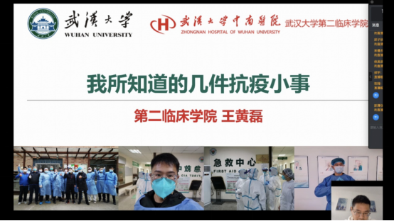 涌现出一批英雄的医护人员和志愿者,成为广大青年团员的身边榜样。为帮助青年们更真实地了解武大人在抗击疫情中所展现的精神面貌,王黄磊老师介绍了他所知道的几件抗疫小事。为我们简单介绍了新冠肺炎和他所支援的武汉市第七医院以及他的一些想法。