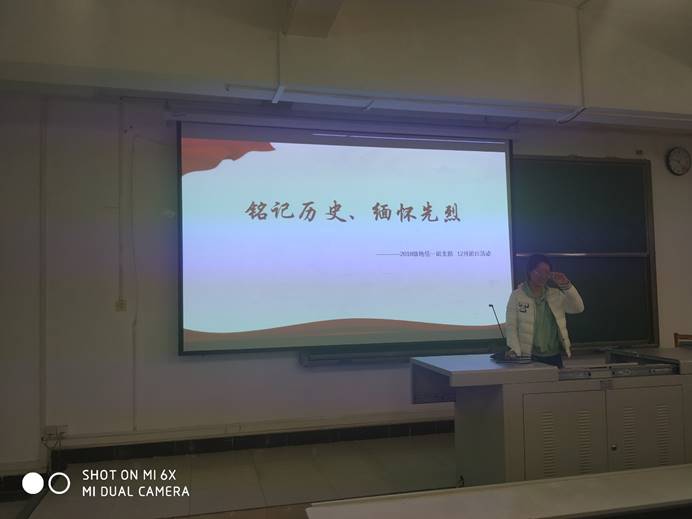 为了宣传爱国思想,让支部团员了解历史,铭记历史,缅怀先烈,在新时代的幸福生活中,不忘为此付出生命的革命先烈们,牢记历史,继往开来,时刻谨记中国人民反对侵略战争、捍卫人类尊严、维护世界和平的坚定立场。为加强支部的思想建设、文化建设,同时增强团支部的凝聚力2018级地信一班团支部于2019年12月13日18:30到21:00办了以“铭记历史,缅怀先烈”为主题的团日活动。