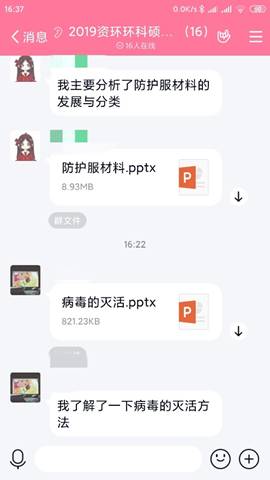 疫情期间,学校及时组织开展网课学习,老师们远程开课,同学们得以正常进行学习。作为环境科学专业的硕士研究生,同学们大多会涉及到材料方面的研究。因此,我们充分发扬了专业特长,结合近期课程内容,查阅文献,查找资料,并进行总结,为此次主题团会做了充足的准备。团会开始后,同学们积极分享自己所总结的资料。
