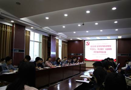 在220报告厅召开“不忘初心、牢记使命”主题教育研究生调研座谈会。院党委书记刘兴国、院党委副书记雷起宏、副院长汪的华、院党政办公室副主任易真、教学管理办公室副主任杨妙玲、兼职辅导员王安琪以及各研究生党支部支委参会。