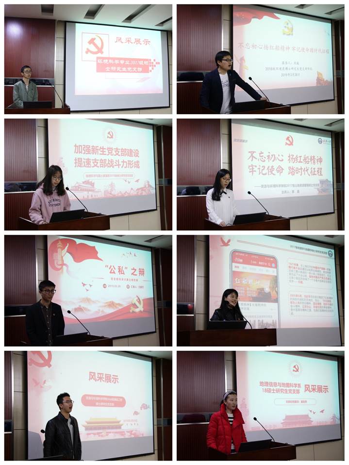 本次研究生党支部风采大赛包括初评和现场展示两个环节。经过对各党支部提交的工作案例材料进行初步评选,共有八个党支部进入现场展示环节。在现场展示的过程中,每个党支部都在短短的时间内对本支部的特色活动和成员风采进行了充分展示。土地资源管理专业2017级硕士研究生党支部展示了歌曲《我们都是追梦人》的手势舞,地图制图学与地理信息工程专业2017级硕士研究生联合党支部结合学习强国APP进行了历史重演……各党支部的风采展示形式多样,各具特色。同时各支部还在学习贯彻习近平新时代中国特色社会主义思想和党的十九大精神,学习领会习近平总书记关于加强党的政治建设、教育工作等重要论述下的背景下,对 “不忘初心扬红船精神,牢记使命踏时代征程”的主题进行了微党课展示,充分体现了91沈先生