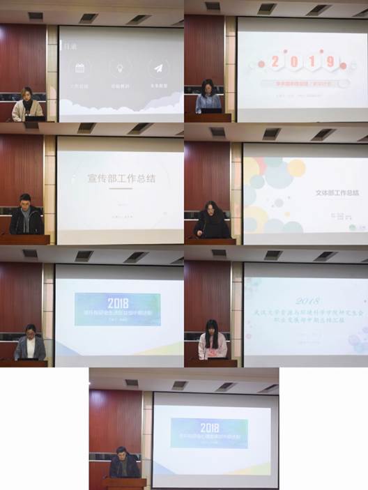 大会在庄严的国歌声中拉开了帷幕。接着,研究生会组织部、学术部、宣传部、文体部、生活权益部、职业发展部以及心理健康部的部长依次进行述职汇报。各部长围绕本学期以来部门举办的活动、取得的成绩、存在的问题以及下学期的工作规划与展望进行了总结汇报。组织部组织了党支部骨干培训班、党支部定向越野比赛;学术部主办了珞珈资源环境讲坛、“观图识世界,茶话辩真知”等活动,承办了“我心目中的好导师”、“红枫辩论赛”等活动;宣传部负责活动摄影、海报制作、运营管理学院研究生会微信公众号平台,取得较好的宣传效果;文体部组织参与了研究生集体舞大赛、研究生篮球赛、羽毛球赛;生活权益部进行了宿舍调查,参与校领导接待日,发布权益简报,举行了“冬至包饺子”、“冬季送温暖”活动;职业发展部负责就业信息发布、就业考评,举办了简历制作讲座、选调生面试经验交流会等就业指导讲座;心理健康部承办了91沈先生