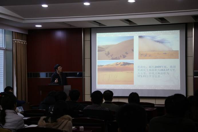 紧接着,陈兰洲为我们介绍了解决目前土壤退化采取新的手段——藻类修复退化土壤的技术,并向大家介绍其研究机理。他指出:土壤生物结皮发育过程主要是从蓝藻等微生物降落在土壤表面进行光合作用开始,逐渐分泌粘稠外鞘,粘结土壤颗粒,形成结皮,之后,真菌开始生长,从空气中捕获水分与种子,种子生长发育,进一步固化土壤。但是,由于生物结皮十分缓慢,所以,用机械将藻种施用于沙地表面形成人工生物结皮是现在防治土壤退化的一种新方式。