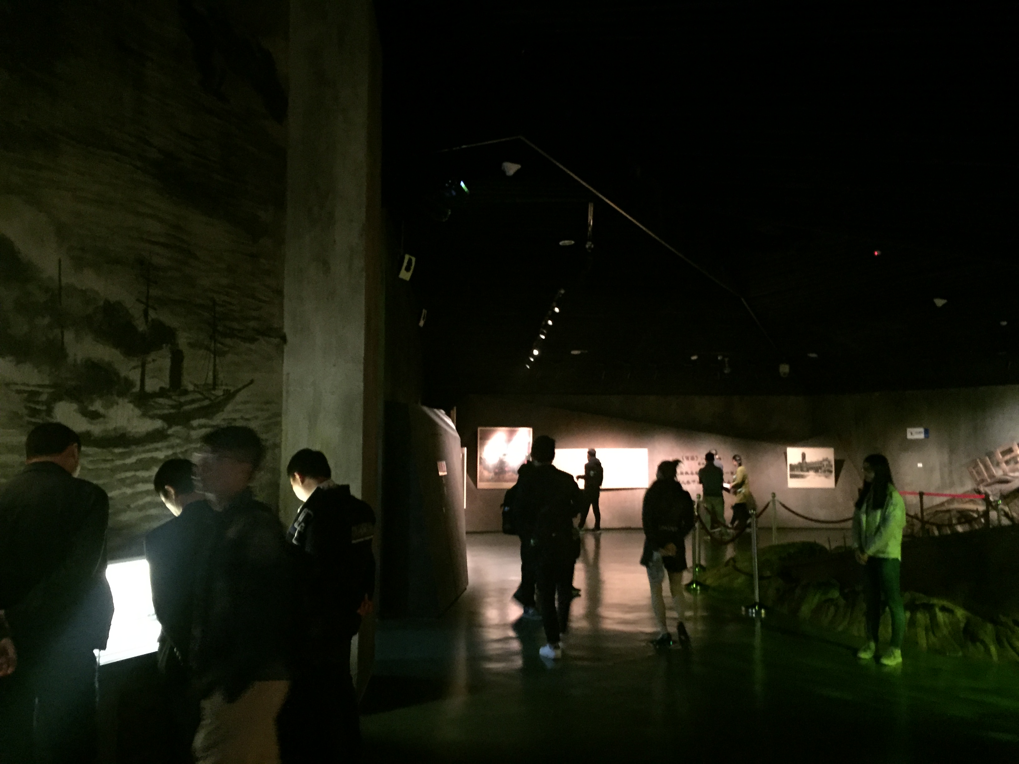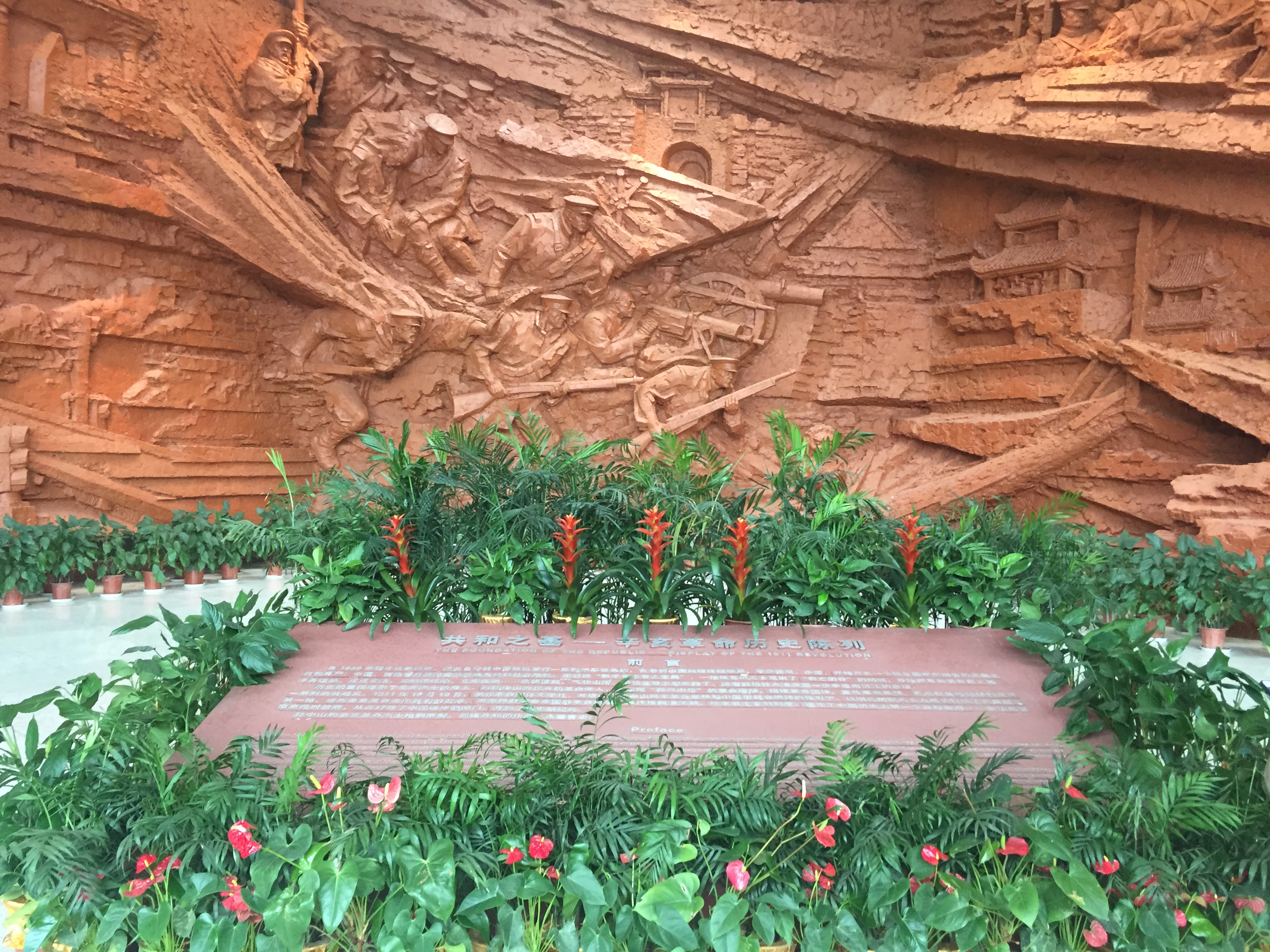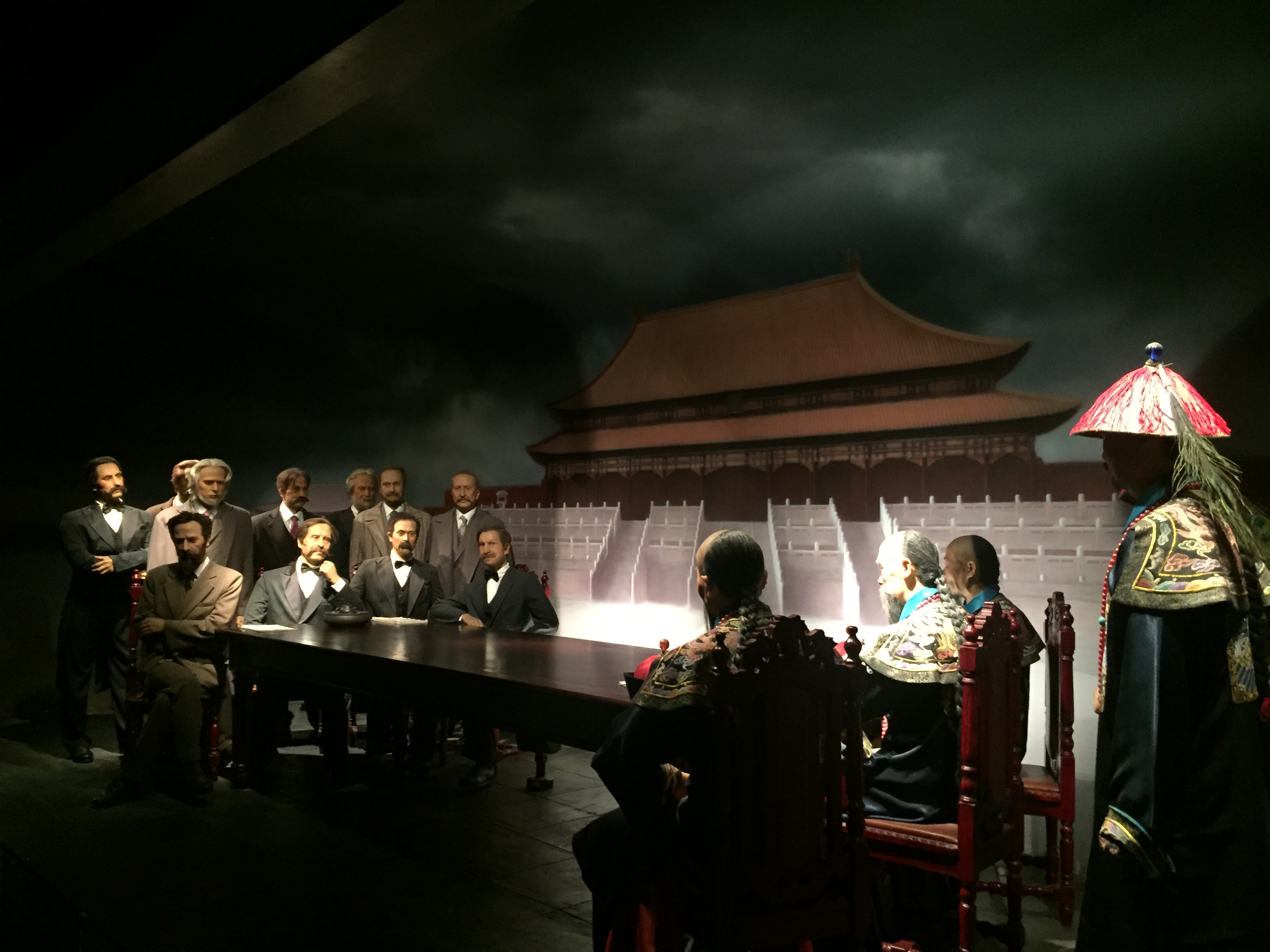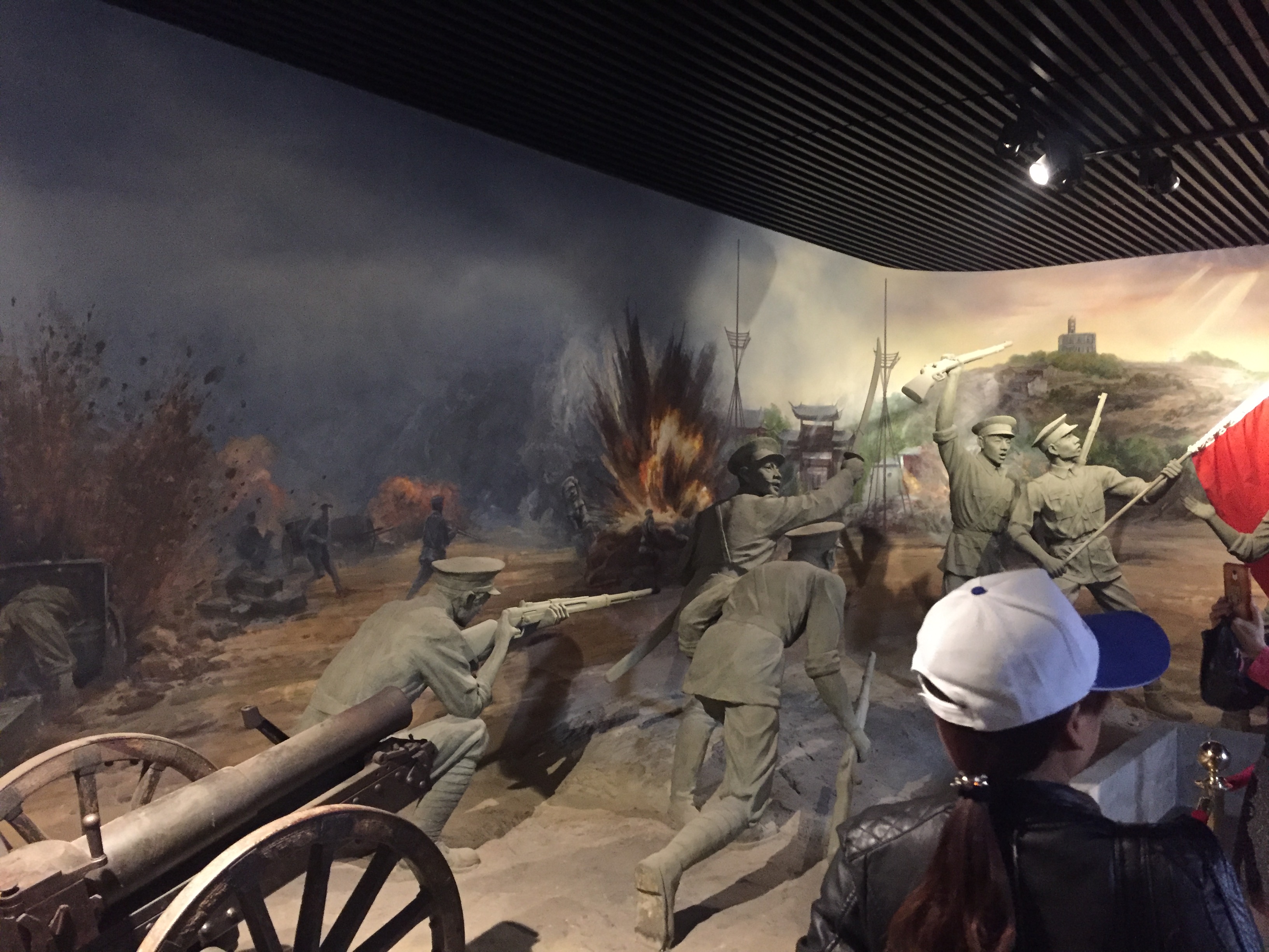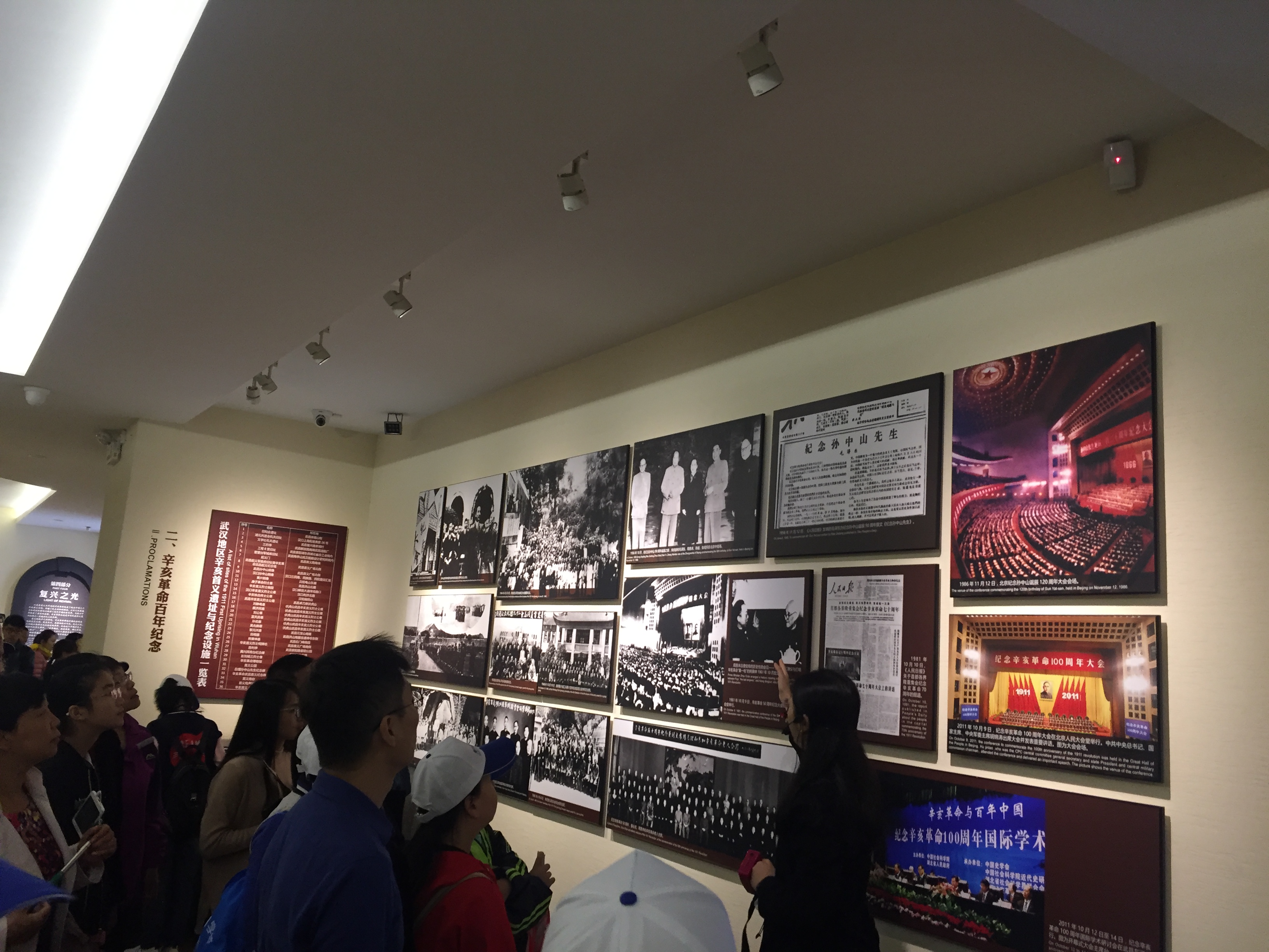 一楼为第一展厅,昏暗的灯光下,走道两旁的柱式石碑上赫然镌刻着清末与外国列强签订的不平等条约的历史事件。南京条约、北京条约、辛丑条约……走向没落的大清国逐步沦为半殖民地半封建社会,让人心中泛起一阵酸楚。展厅的其余部分还用蜡像、油画、微缩景观等方式,为我们还原了那个动荡不安的年代。在第二展厅,我们了解了以孙中山为首的革命党人广泛宣传民主革命思想,为革命造势的过程。从同盟会成立到黄花岗起义失败,革命的力量不断壮大。随着保路运动的爆发,革命的时机终于成熟。在第三展厅,1911年10月10日晚的武昌城,枪声打破静悄悄的夜晚,湖北革命党人临危发难,攻占楚望台军械所,取得了起义的初步胜利。第四展厅地面铺开了一幅中国地图,辛亥革命的爆发,获得了中国各省的积极响应,中华民国的成立。最后一个展厅里详细记录了后人缅怀辛亥革命,保护修缮旧址遗迹的故事。