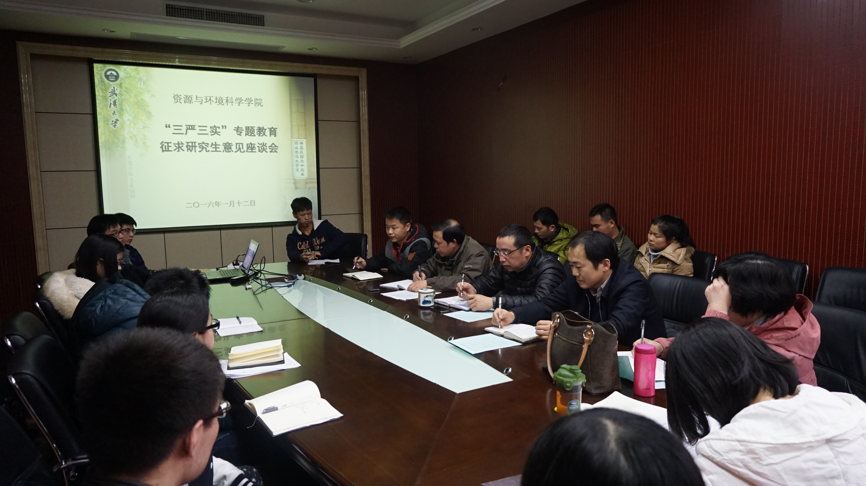 室外寒风瑟瑟,室内气氛热烈。1月12日下午,资环学院504会议室济济一堂,20多名研究生代表参加了学院举办的“三严三实”专题教育征求意见座谈会。院党委书记彭宇文,副院长钱沙华、雷起宏出席,院党委副书记江尧林主持会议。