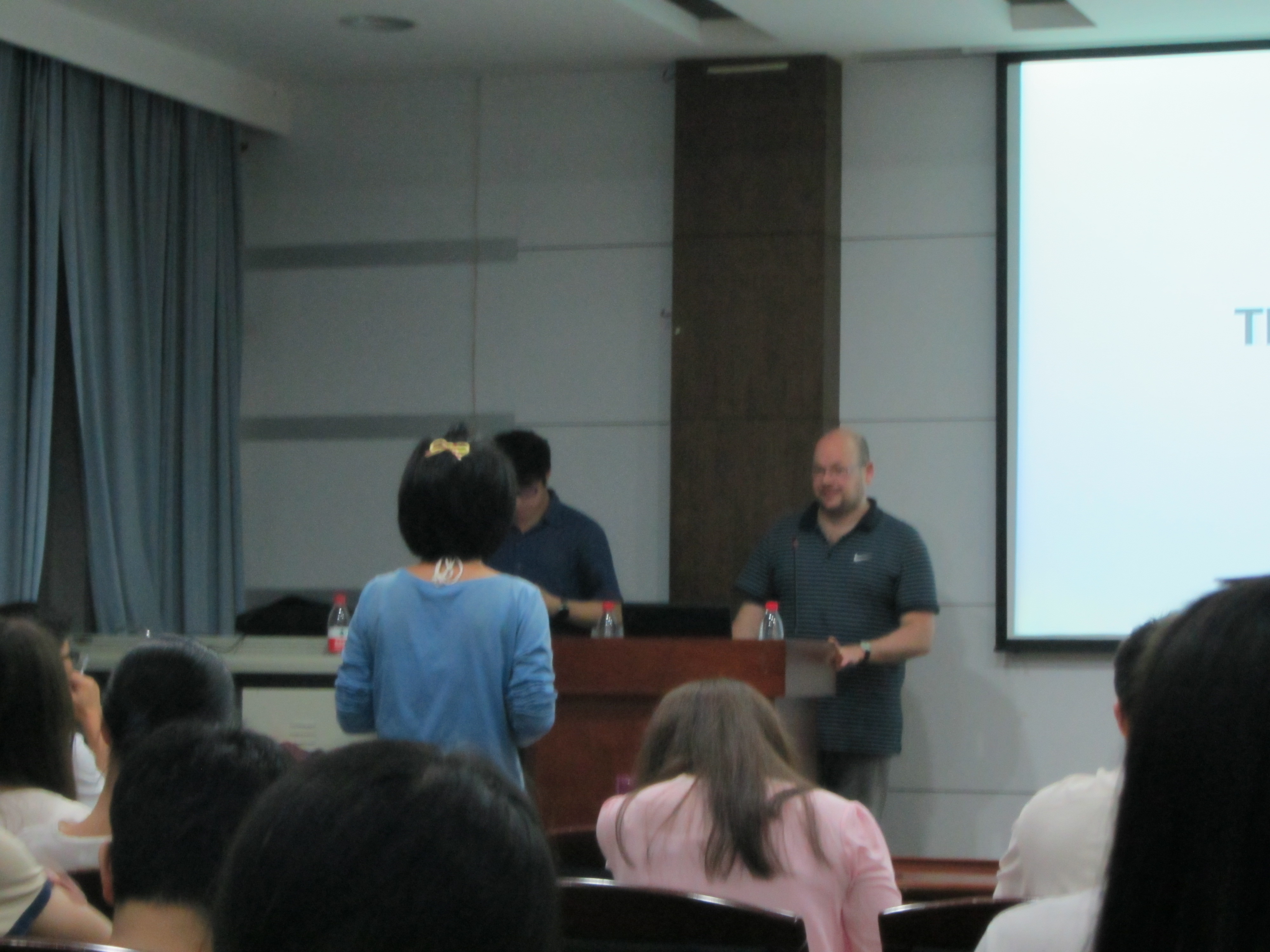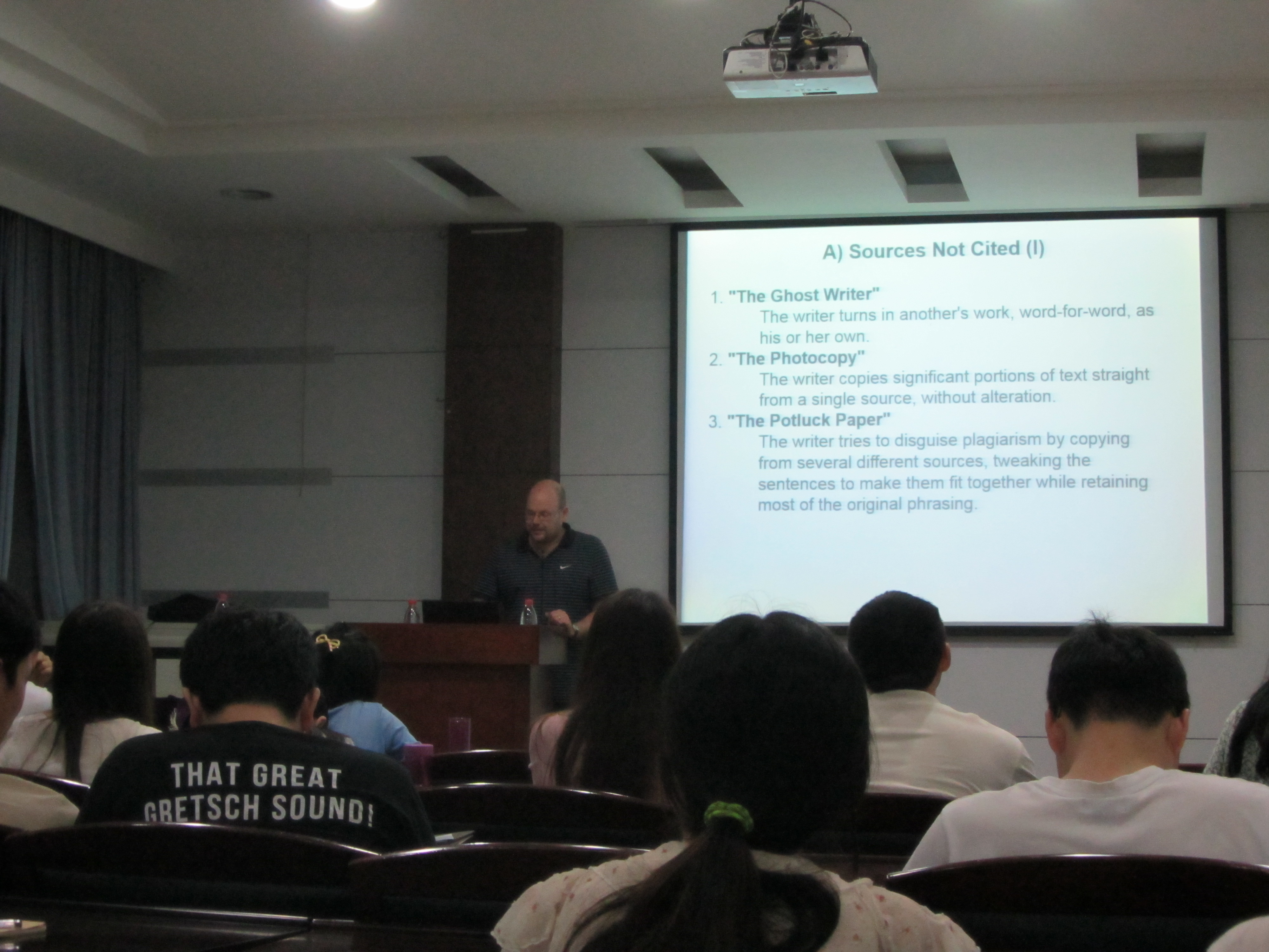 费腾副教授首先就“道德是否具有相对性”这一问题提出了自己的看法,并结合自己的荷兰留学亲身经历讲述了国内外学生对学术道德方面的某些差异,接下来他以幽默、风趣的方式阐述了科技论文写作过程中存在的“十宗罪”、“犯罪后果”及“天外飞仙”,如抄袭、剽窃、伪造或篡改数据、一稿多投等行为,并且针对每一宗罪行提出了整治方法,深刻而有效地提醒同学们在科技论文写作过程中时刻规范言行,避免犯“十宗罪”。Stephan Angsuesser讲师则向同学们介绍了学术不端的定义与类型,列举了几个国外的政要名人因学术不端而“落马”的案例,以严肃而诚挚的方式告诫大家,任何人最终都要为自己的不诚信行为付出惨痛代价。两位老师通过生动形象的演讲,使在座同学认识到抄袭、剽窃等学术失范行为带来的严重后果,明白了诚信科研的重要性,增强了学术规范意识。