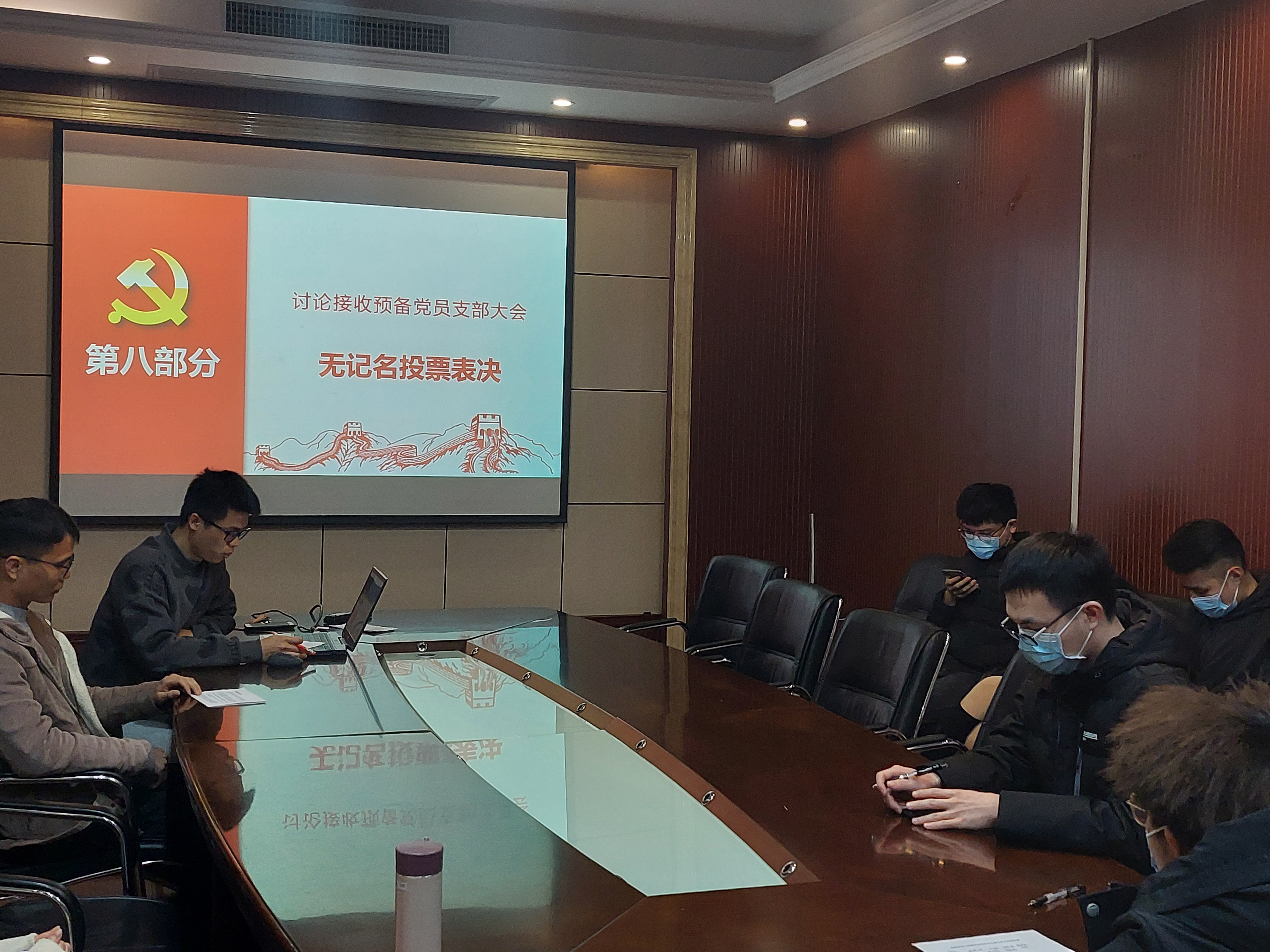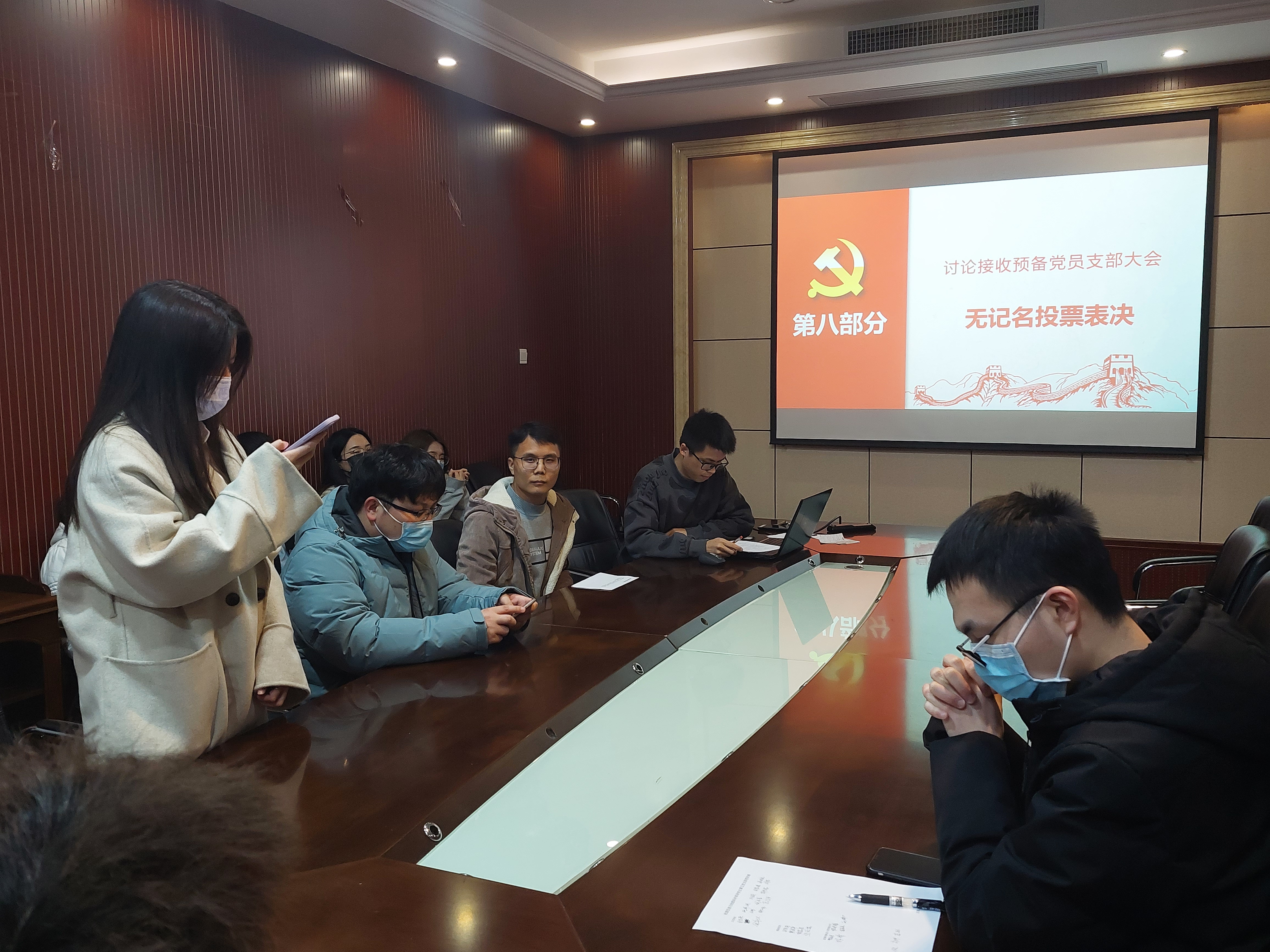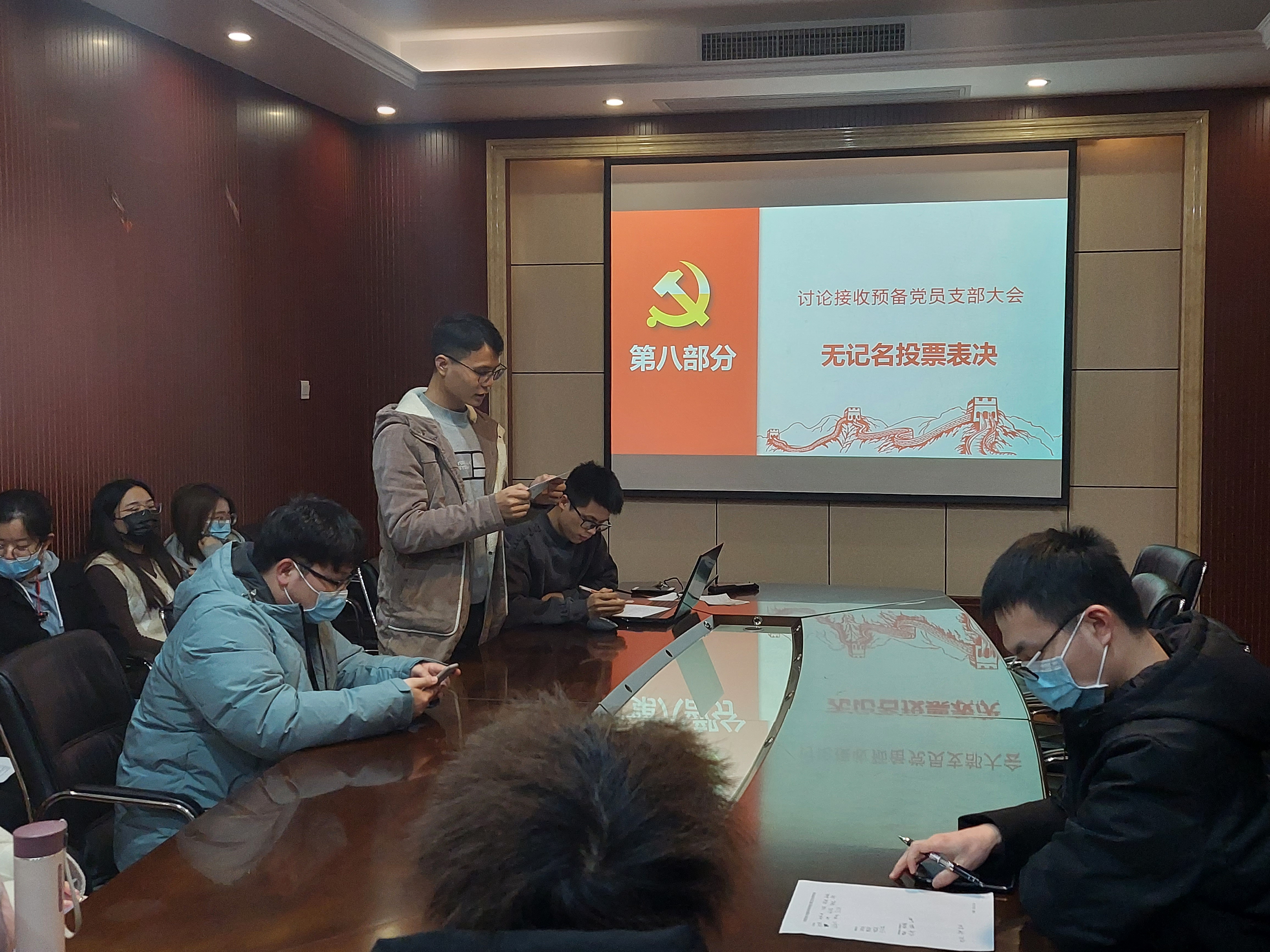 随后,参会的正式党员就林倩同志与孔博同志的接收申请进行无记名投票。经过监票人、计票人发票,在投票结束后对投票结果进行唱票,全体党员一致通过了接收林倩同志与孔博同志为预备党员的申请。