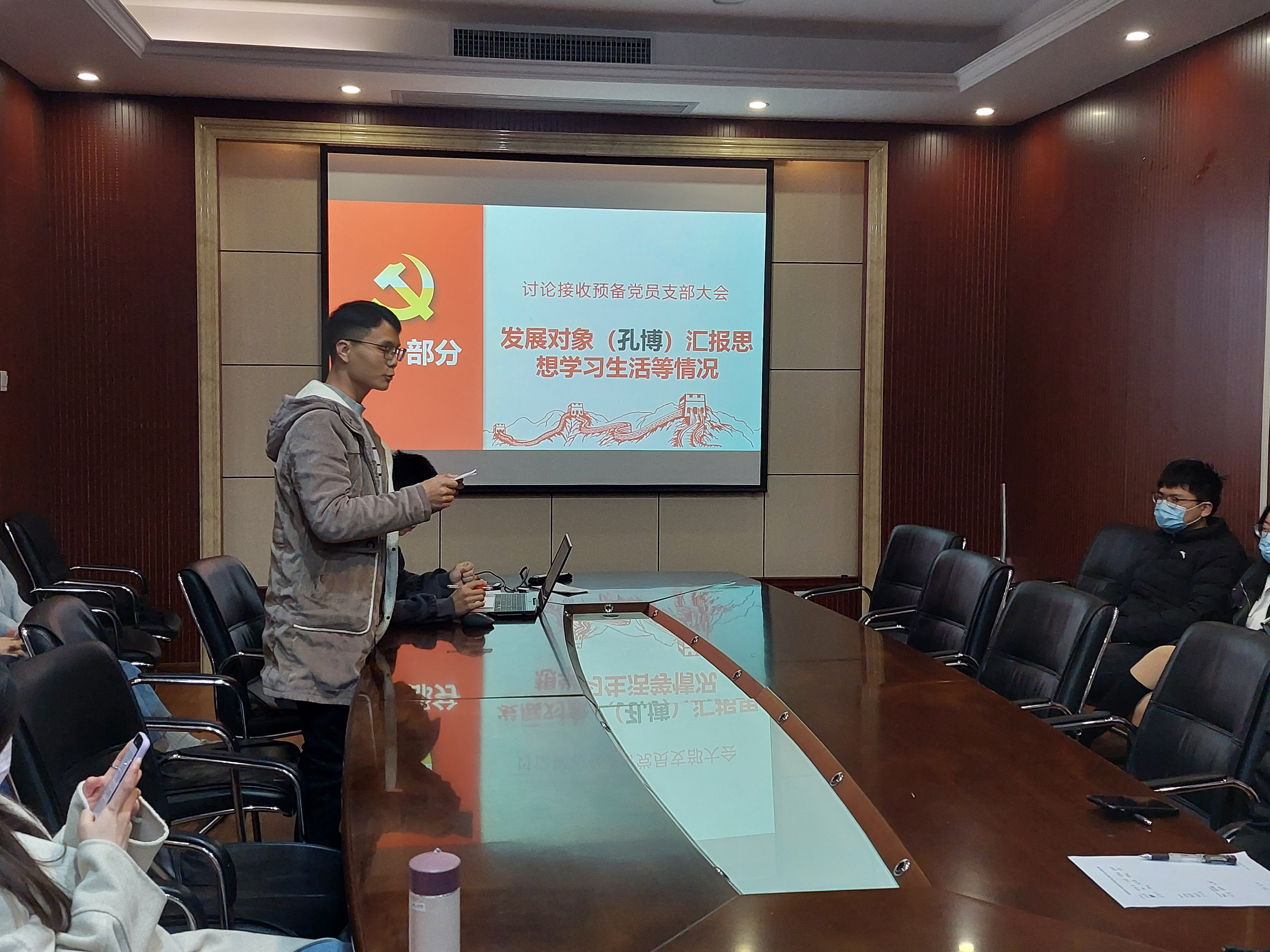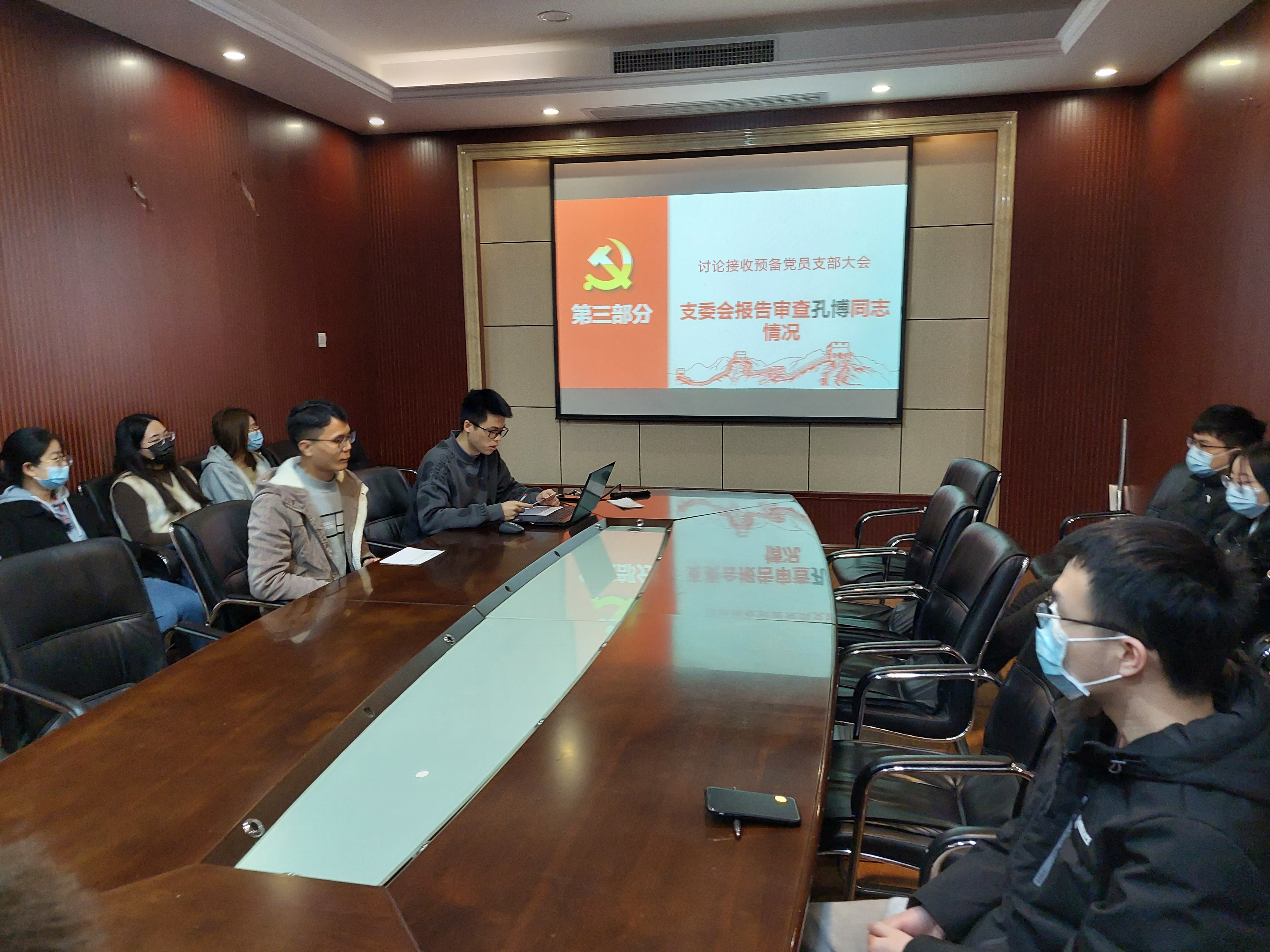 504会议室召开接收预备党员支部大会。本次会议由支部书记余华飞同志主持,主要内容包括对林倩同志与孔博同志的预备党员接收讨论。本次会议应到正式党员及预备党员18人,实到参会党员15人,发展对象与入党积极分子也参与了会议。