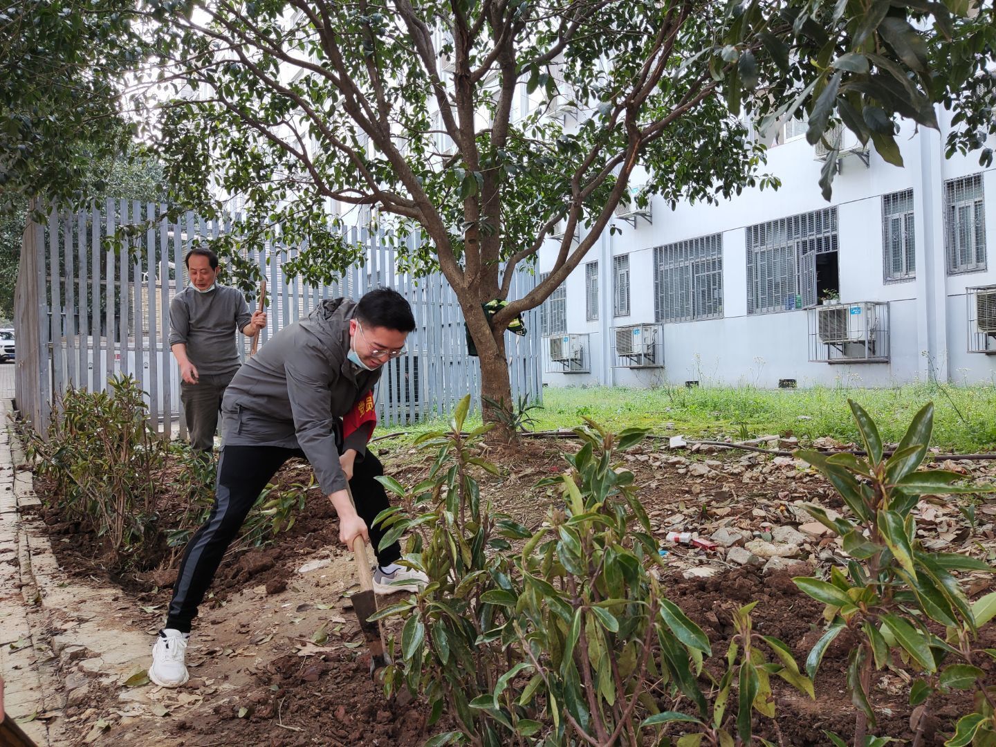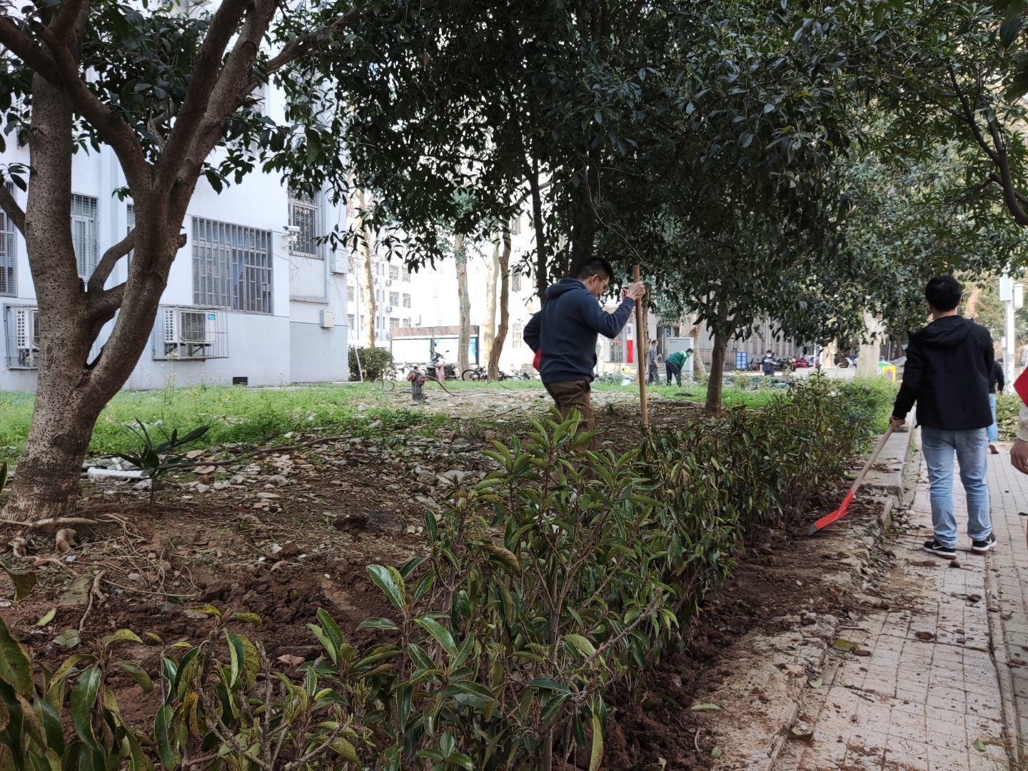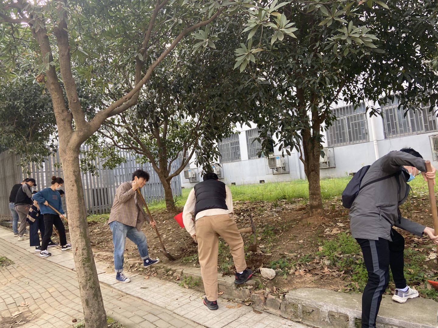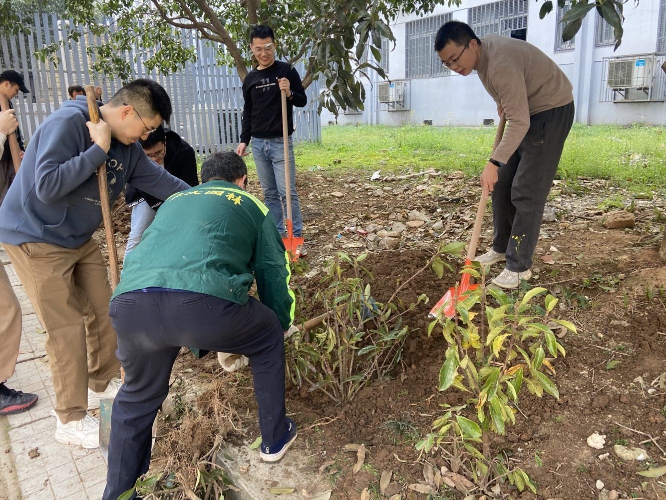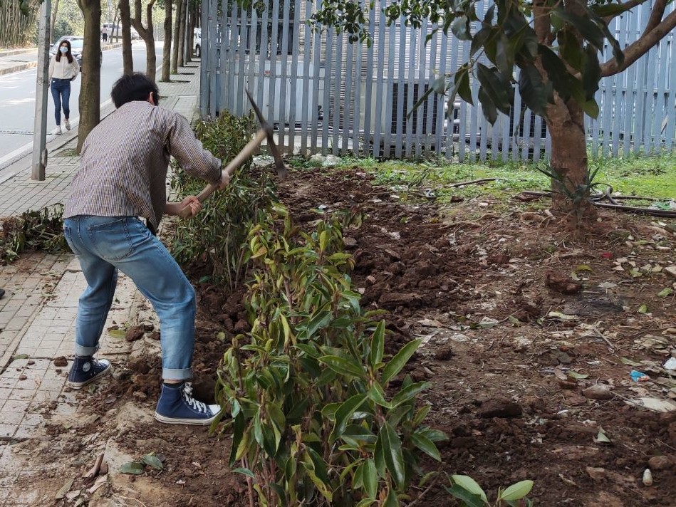 信息学部绿化环卫队的大力支持,该单位为活动提供了树苗和工具。在植树现场,大家三五成组,相互配合默契,场面繁忙有序、气氛活泼热烈。党员们搬运树苗、挥锹挖坑、填土栽种,相互协作、相互配合、有条不紊,展现出一片热火朝天的劳动场景。