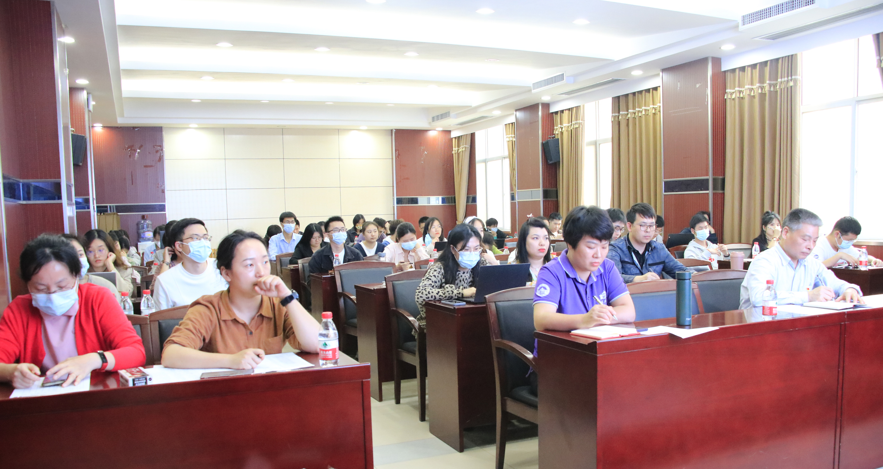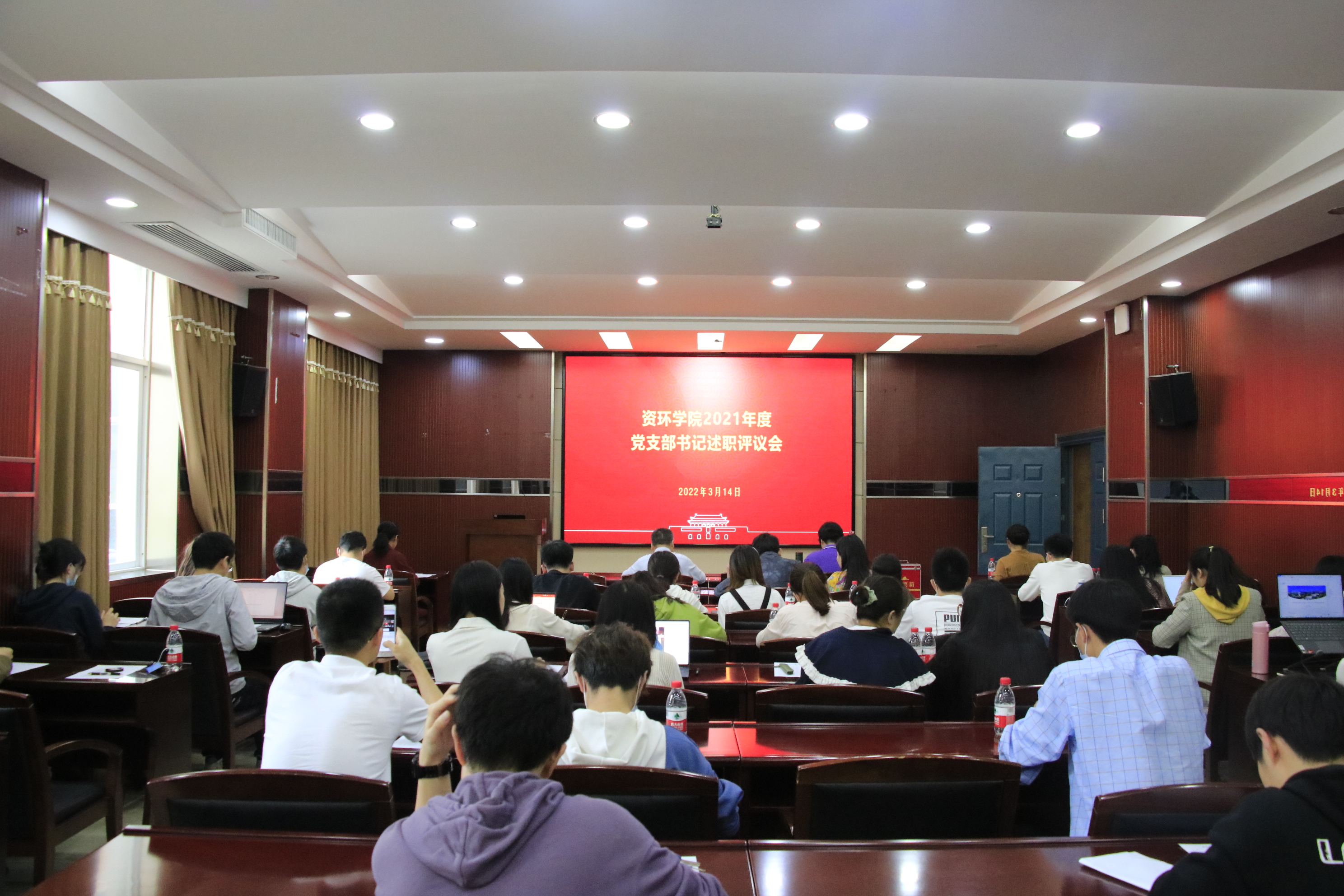 2021年度党支部书记述职评议在学院220会议室召开。出席会议的有学院党委书记刘兴国,党委副书记冯丹、马丽华,党政办公室副主任易真,辅导员梅菲、李韩,5个本科生党支部、17个研究生党支部书记及支委代表。会议由马丽华主持。