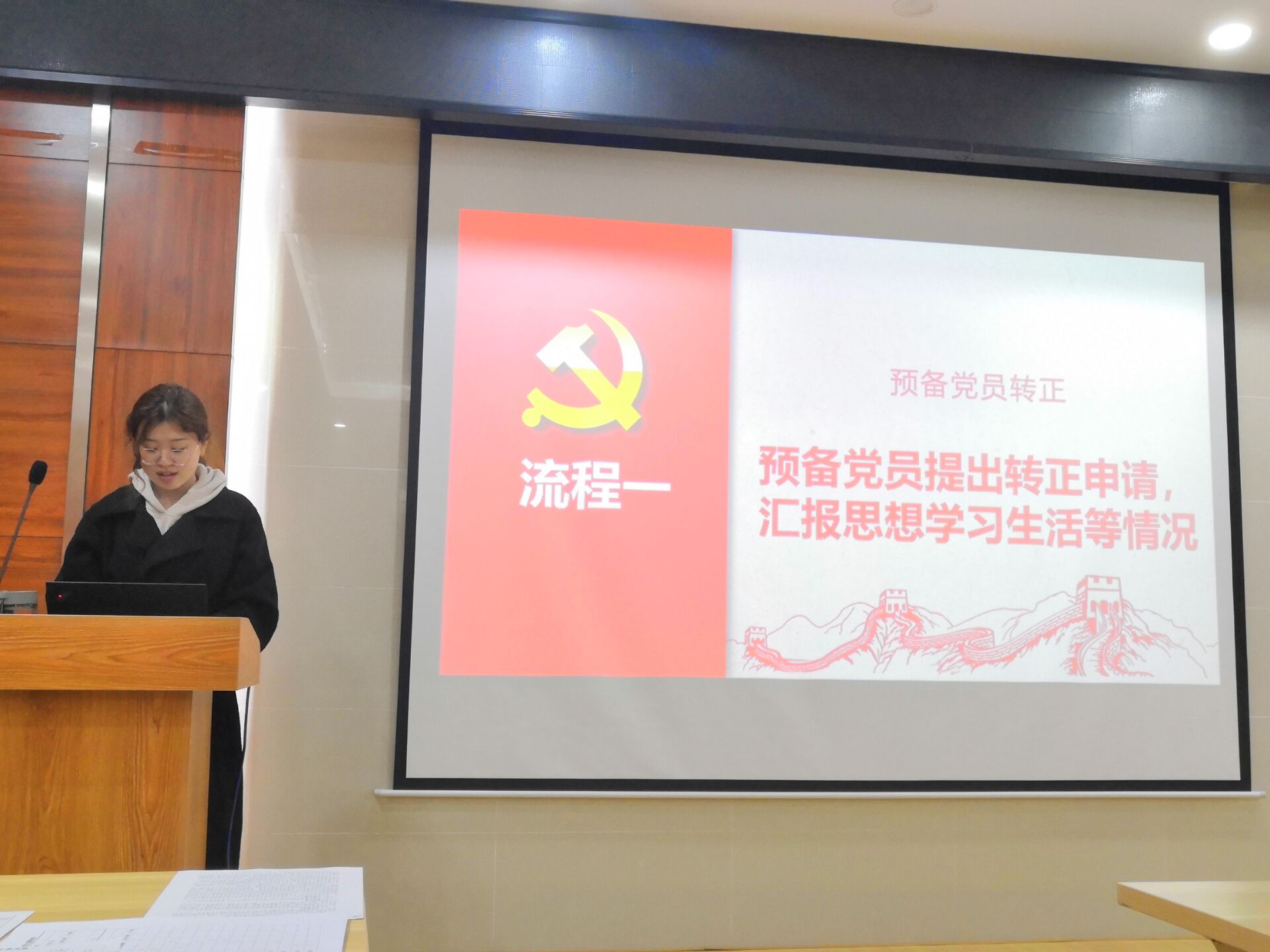 会议第二项,预备党员王佳雪同志的转正讨论。首先,由王佳雪同志提出转正申请,汇报在预备期间的思想、学习、生活等情况;接着由王佳雪同志的入党介绍人汇报预备党员王佳雪在预备期间的表现情况。