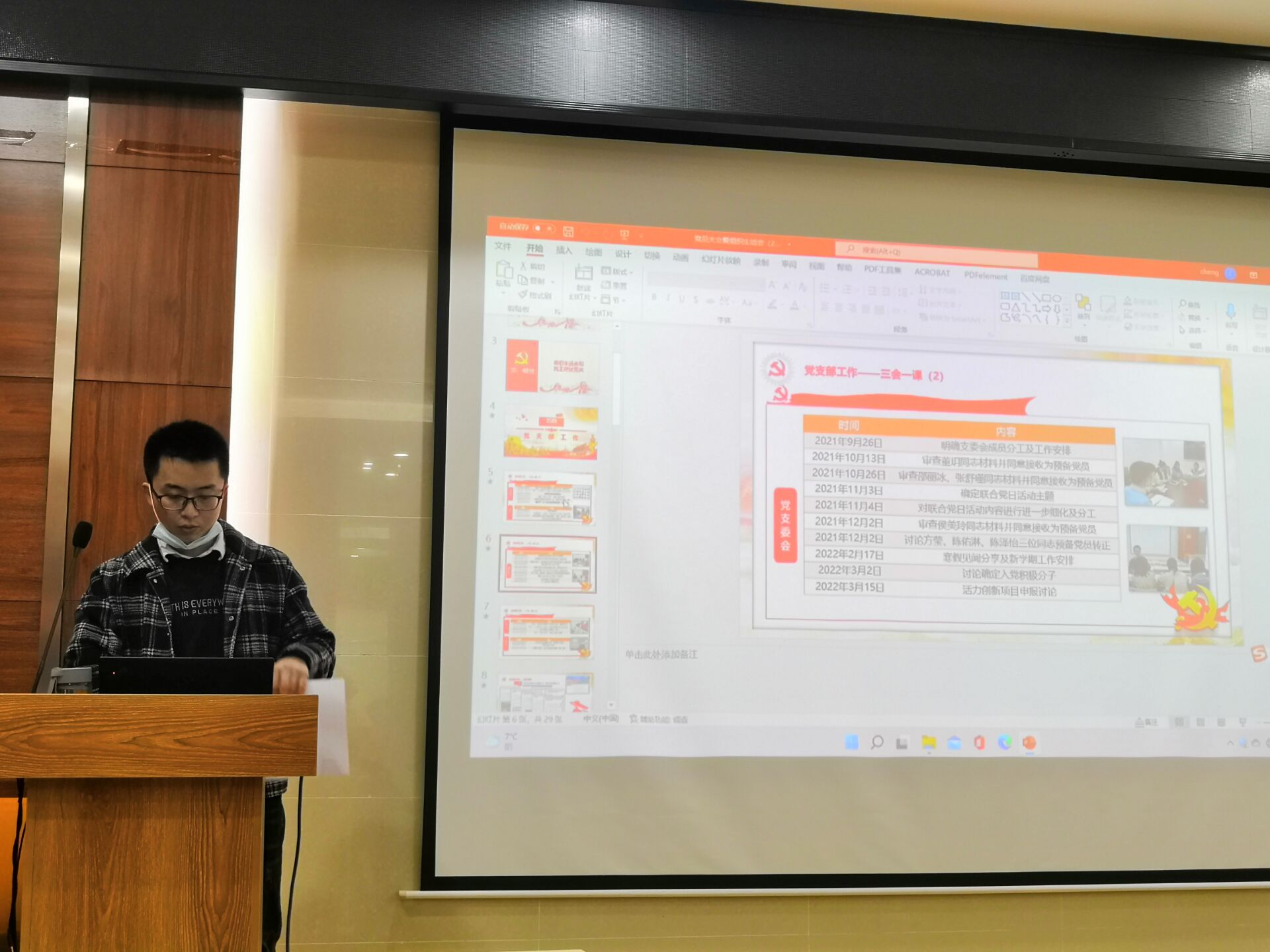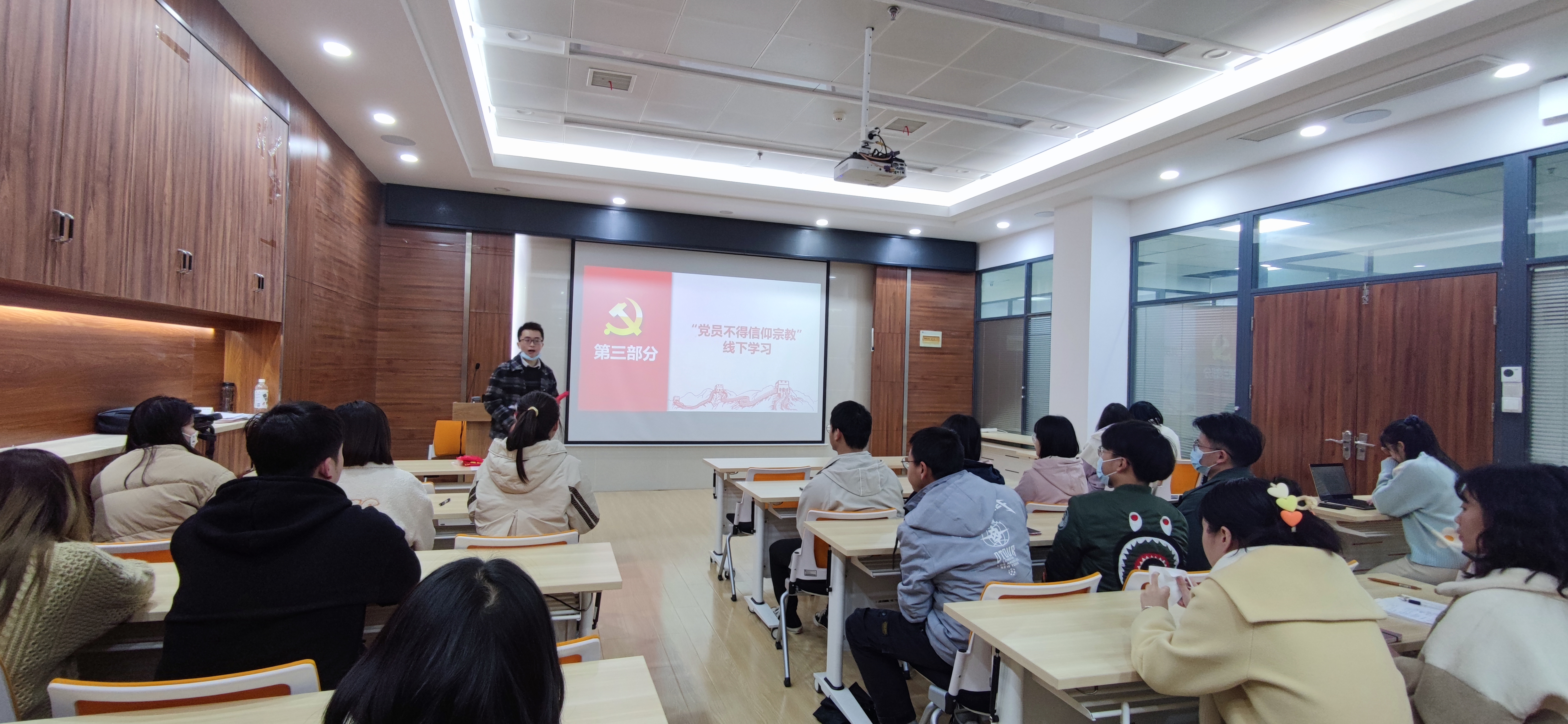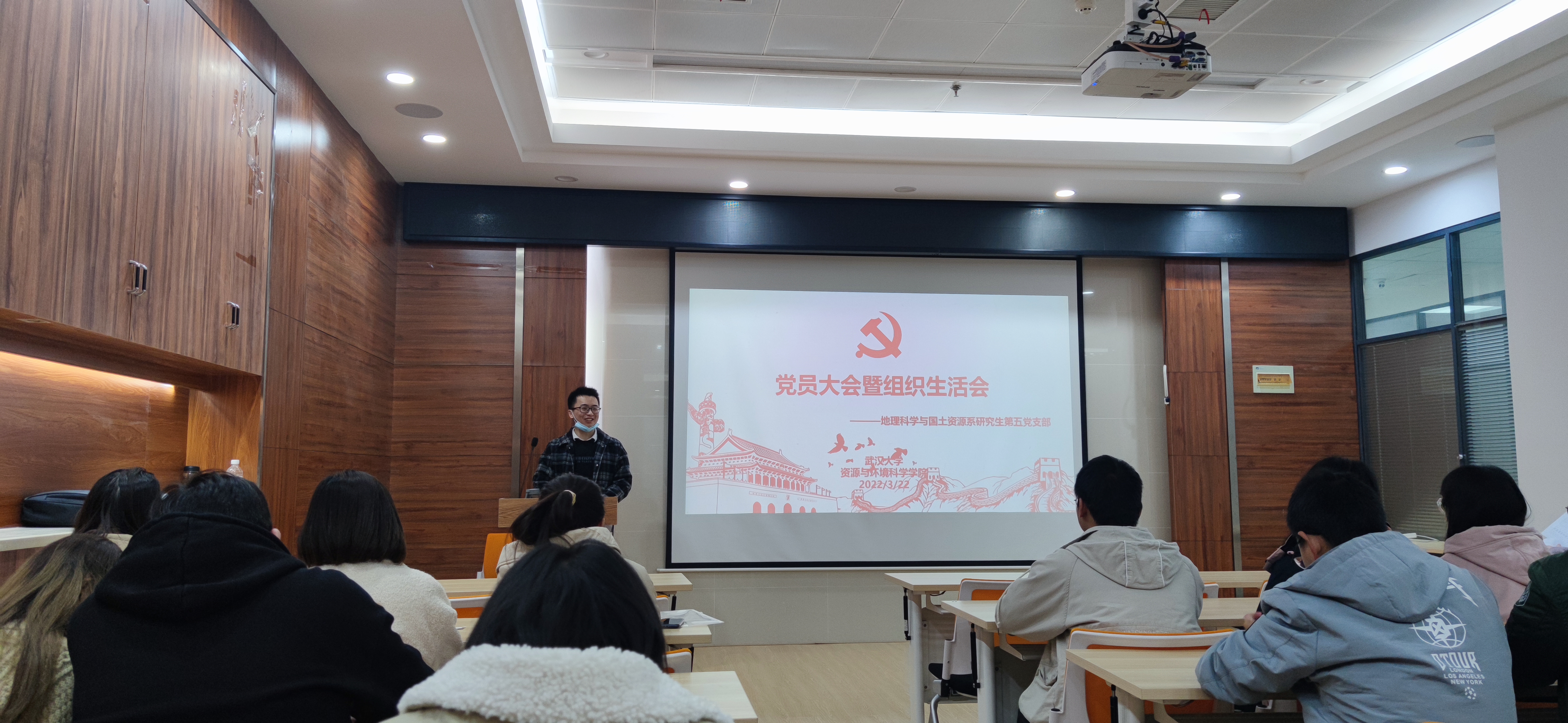 2022年3月22日晚上19:00,地理科学与国土资源系研究生第五党支部于电脑城429会议室召开党员大会暨组织生活会。本次会议由党支部书记程鹏同志主持,主要内容包括组织生活会和民主评议党员、预备党员王佳雪同志的转正讨论、“党员不得信仰宗教”线下学习、“学雷锋,做榜样”学习教育、两会精神学习。