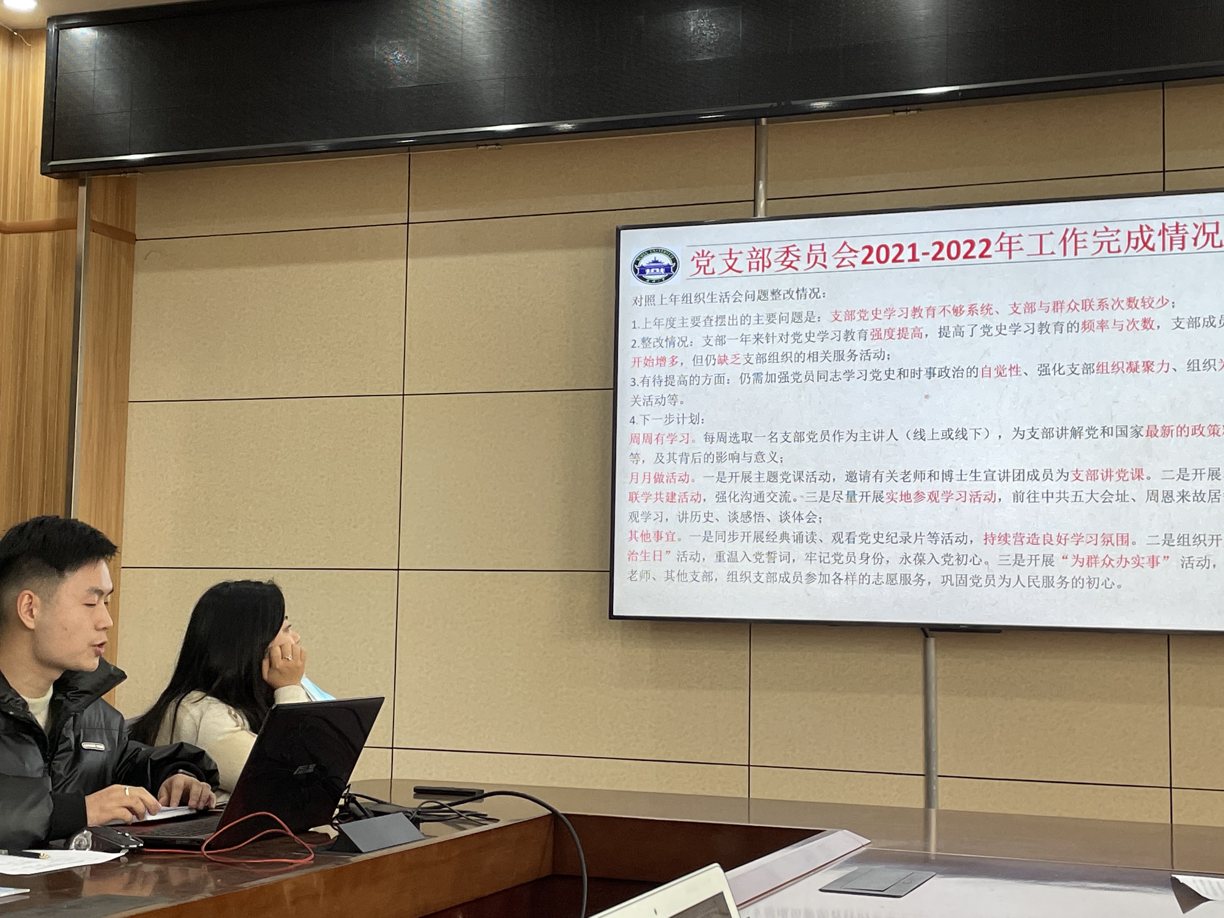 首先由胡康同志对支部委员会在2021-2022年工作的完成情况进行汇报。过去的一年中,支部结合时事热点,开展多次党史学习教育,其中包括十九届六中全会精神学习、党的百年奋斗重大成就和历史经验的决议的学习等。发展党员方面,支部讨论了郑凡、钟璇、李潇祎、郭娜、苏思倩和汪懿等六人的转正申请,同时也吸纳了一批优秀的发展对象成为预备党员,吸纳了一批优秀团员作为积极分子培养,支部队伍逐渐庞大。为群众做实事方面,2021年3月支部成员尹雅洁作为医护人员赏樱专场志愿者,给参观的医护人员提供服务;2021年8月支部党员同志王登台参加武大测绘社区核酸检测,帮助社区工作者减负;2021年9月支部成员张珊珊作为研途迎新志愿者,帮助新生更快适应新环境。