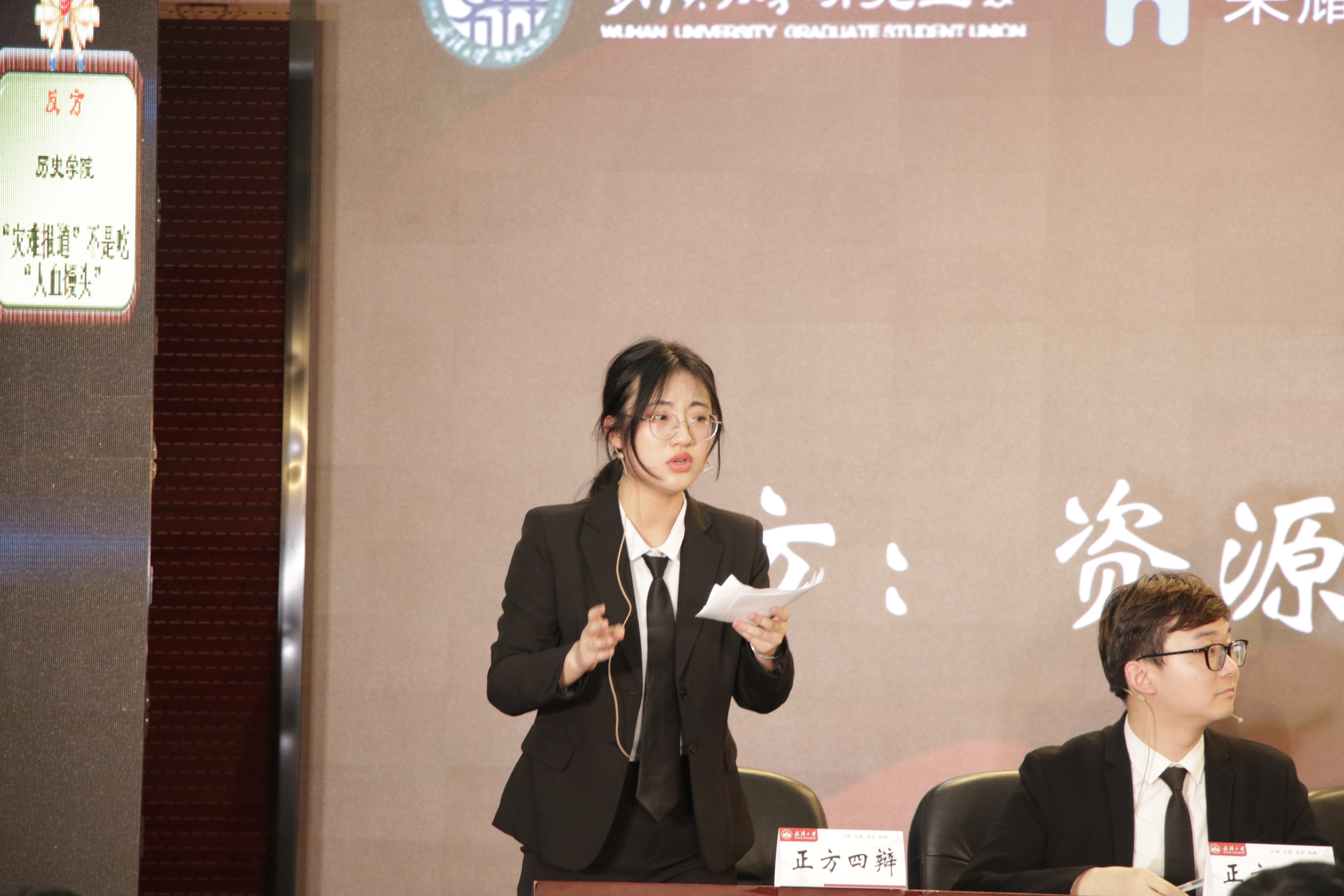 在自由辩论环节,双方进行了一番唇枪舌战,我方引经据典提出灾难报道不能脱离介质存在,在媒体、渠道以及受众构成的闭环中,任何一方的问题都可能会导致下一环节的崩溃。我方强调不仅仅要保护媒体人,也要保护动态闭环中的每一种要素。反方旁征博引,将吃人血馒头的行为和对待灾难报道的方式从价值取向上区分开来,并以数据佐证灾难报道有助于动员全员参与灾难救援的观点。
