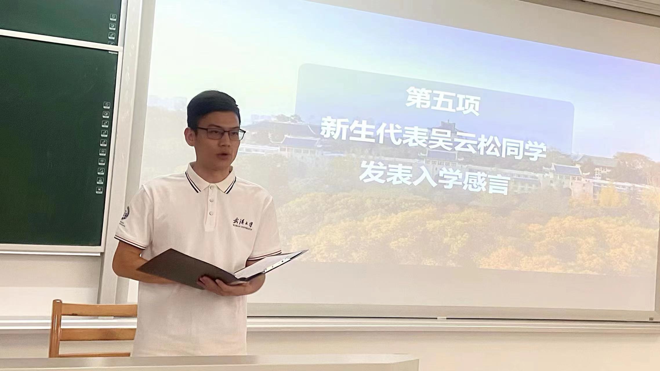 新生代表吴云松同学发表入学感言。一年支教归来,他感慨薪火相传的生生不息,新生活开启,他表露新生的自勉自励:要自立自强,要自律自觉,要坚定不移地努力,以展现时代青年的责任与担当。