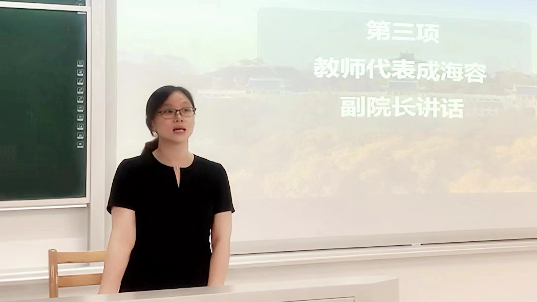 接着,成海容副院长作为教师代表发言。成院长为同学们提供了三个科研学习上的建议:首先是希望同学们要尽快明确科研方向,制定分期目标与学习计划;其次是要有创新思维,在创新初探阶段要有气魄,也要脚踏实地多读文献多思考;最后要多向导师请教,多与同学沟通,尽快融入课题组,从而更快过渡到研学新征程上。