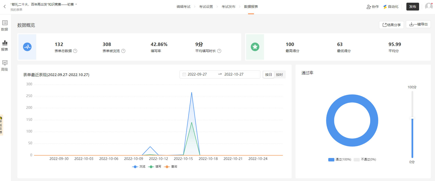本次知识竞赛初赛于10月16日在线上举行,来自十余个学院的46支队伍共138人报名参与线上答题。为保证比赛公平性,所有试卷题目均为随机抽取,在工作人员前期的认真筹备和答题过程的实时跟进下,线上答题顺利进行,共收取132份有效试卷。