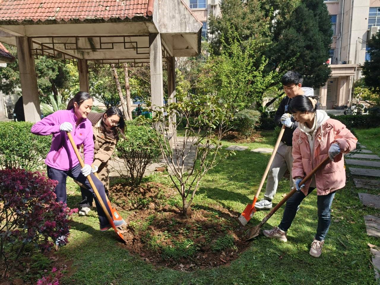 在张主任和朱主任的耐心讲解和亲身示范下,党员同志们逐渐掌握技巧,干劲十足。清理杂物的同学像开启了抓娃娃机模式,每一耙都必定捞起一大堆杂物;修剪枝丫的同学化身植物美容师,为修剪后的植物带去更多的阳光照耀;种草的同学相互之间默契配合,搬运吉祥草、挥锹挖坑、填土栽种,一气呵成。活动有条不紊地进行着,现场一片热火朝天的劳动场景。
