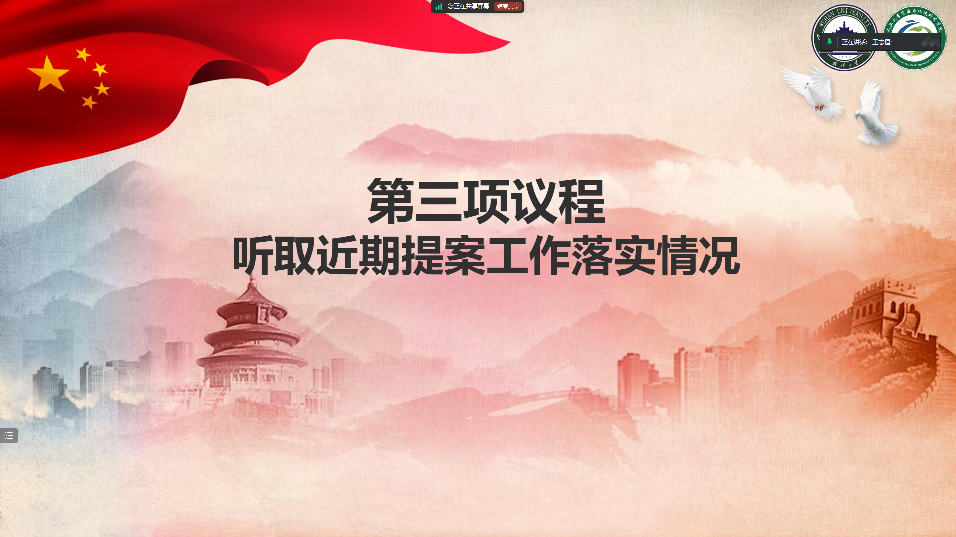 会议第三项议程,听取近期提案工作落实情况。权益工作分管主席王志恒同学对近期处理的提案进行回复,常代办工作人员刘芷欣对新收集到的提案进行汇报。