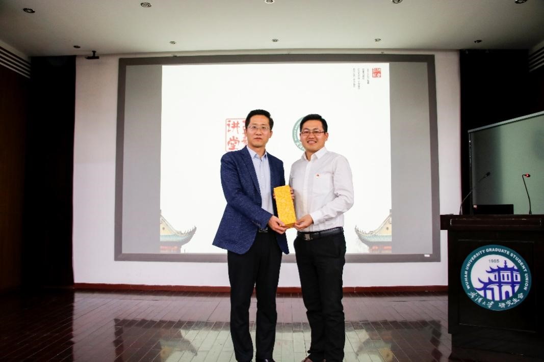研究生会主席团成员、博士生分会主席韩承熙同学为沈教授献上了“弘毅讲堂”纪念奖杯。