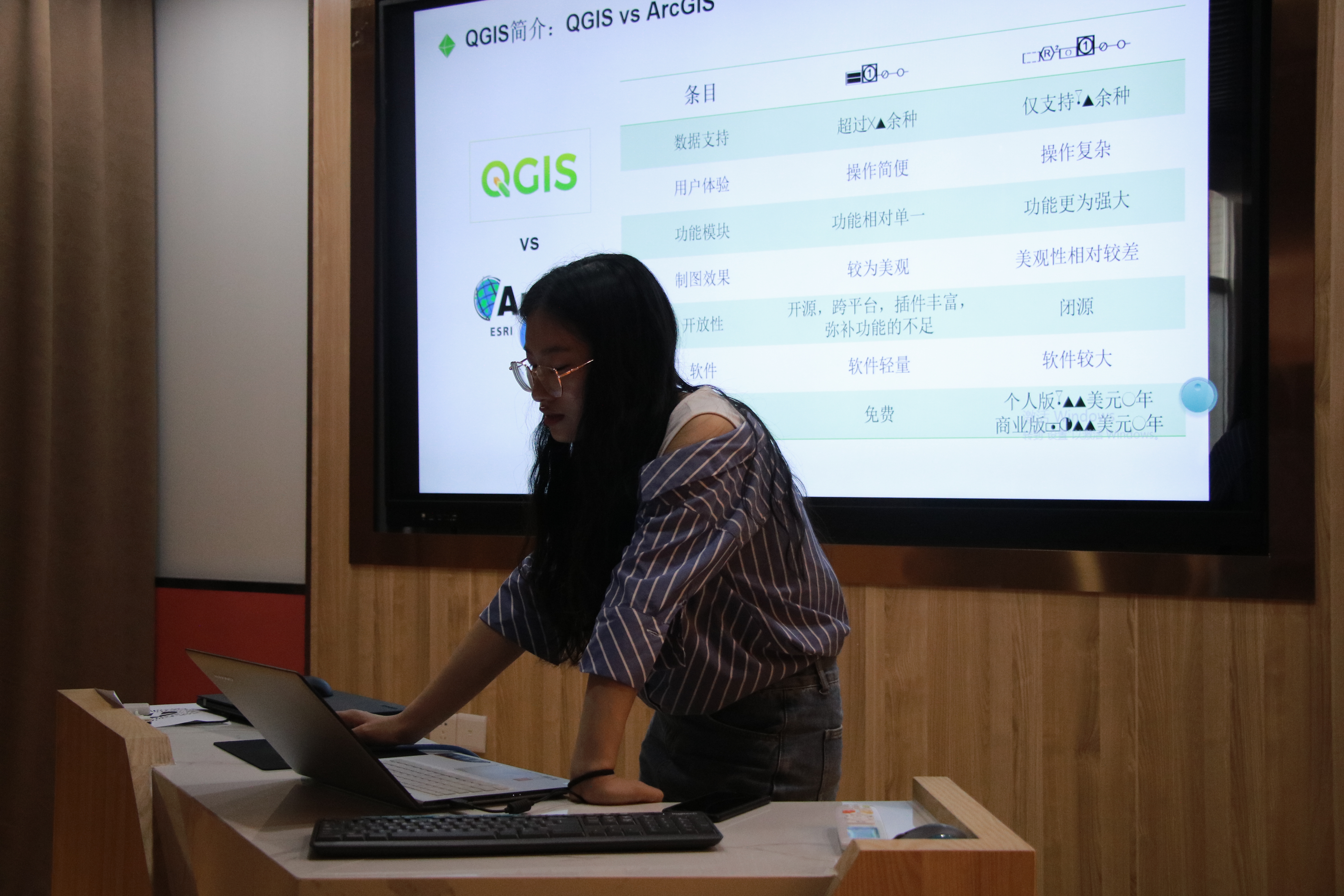 接着,刘越同学将传统可视化软件ArcGIS与QGIS的数据支持、用户体验、功能模块、制图效果、开放性、价格等六方面进行详细的对比分析,QGIS虽然在功能的广泛度以及性能的稳定度两个方面稍显逊色,但是其数据的支持度、制图效果的美观度、开放性及用户体验感等方面完全优于ArcGIS。
