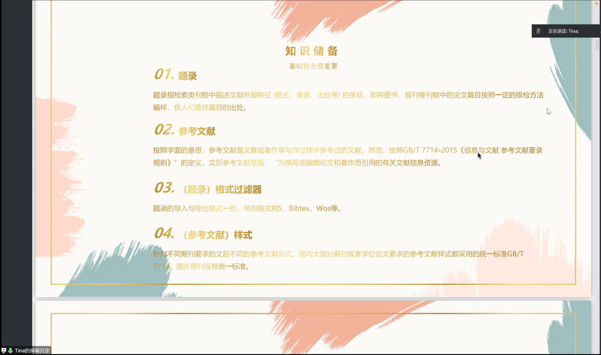 随后,张宁老师对于每一类工具都进行了详细讲解。首先,每个论文都需要题录供人查找篇目出处,因此题录需要运用格式过滤器对导入导出格式进行管理,其次,参考文献也是论文中不可或缺的部分,不同期刊要求不同的参考文献形式。这些部分都需要运用工具进行管理调整。在文献管理的过程中,张宁老师推荐使用NoteExpress工具,并介绍了它的基本功能,获取地址以及学习资源,录制了三个视频帮助同学们更为直观地了解工具使用。