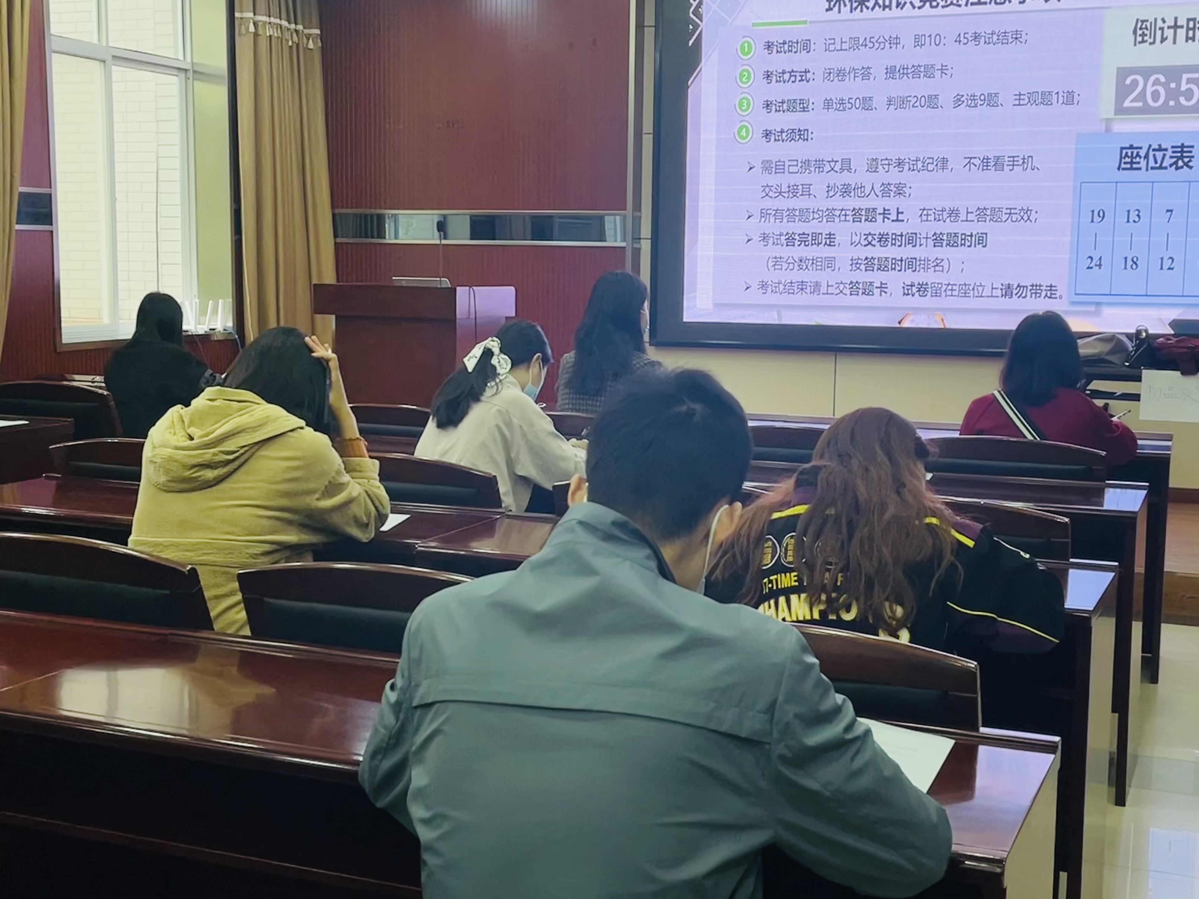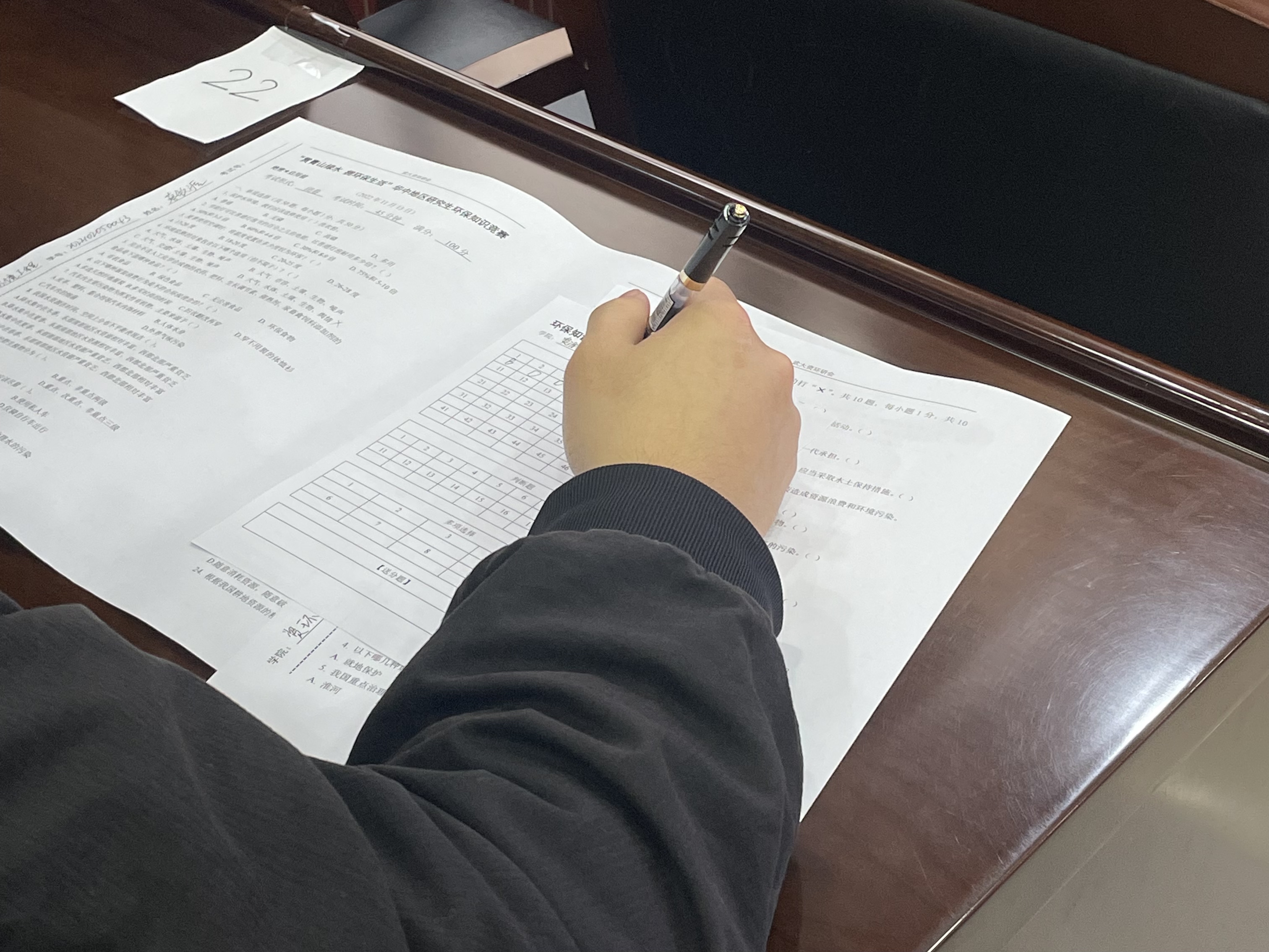 环保知识竞赛采用线下作答形式,于11月13日上午10:00在91沈先生 220会议室举行。活动吸引了多个学院、不同专业的研究生积极参与。本次活动严格遵守学校防疫相关规定,参与同学健康码均为绿码,并于现场隔位就坐。