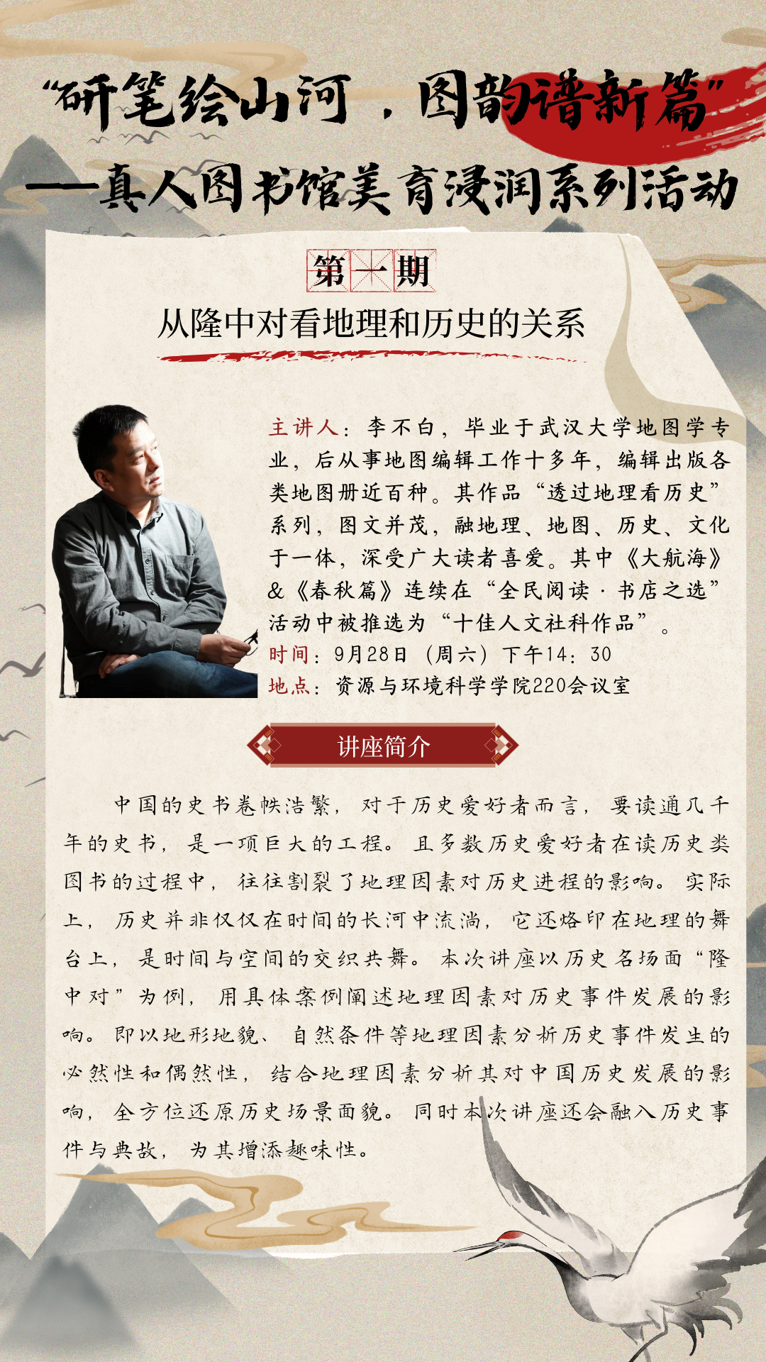 地图学专业的李不白前辈为主讲人,李前辈从事地图编辑工作十多年,编辑出版各类地图册近百种。其作品“透过地理看历史”系列,图文并茂,融地理、地图、历史、文化于一体,深受广大读者喜爱。其中《大航海》&《春秋篇》连续在“全民阅读·书店之选”活动中被推选为“十佳人文社科作品”。本次邀请到李前辈以书为引,带领同学们一起以地理单元为轴心,了解中国历史发展的脉络。