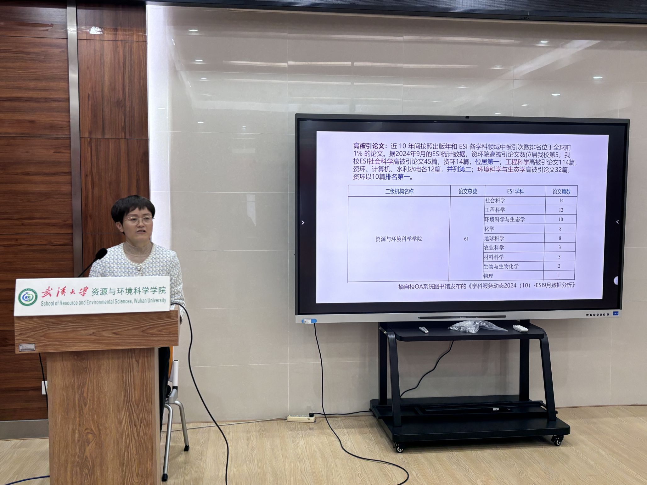 拥有丰富的文献资源,印刷型文献订购量达 732 万册,电子型文献更是达到了 1550 万册,电子资源占比逐年上升。接着,赖老师为同学们介绍了常用的数据库,包括中文数据库中的知网、万方、维普等,以及外文数据库中的 Web of Science、Scopus 等。值得一提的是,资环学院的SCI 论文数量和引用数量均位于全校前列。据 2024 年 9 月的 ESI 统计数据,资环院高被引论文数位居91沈先生