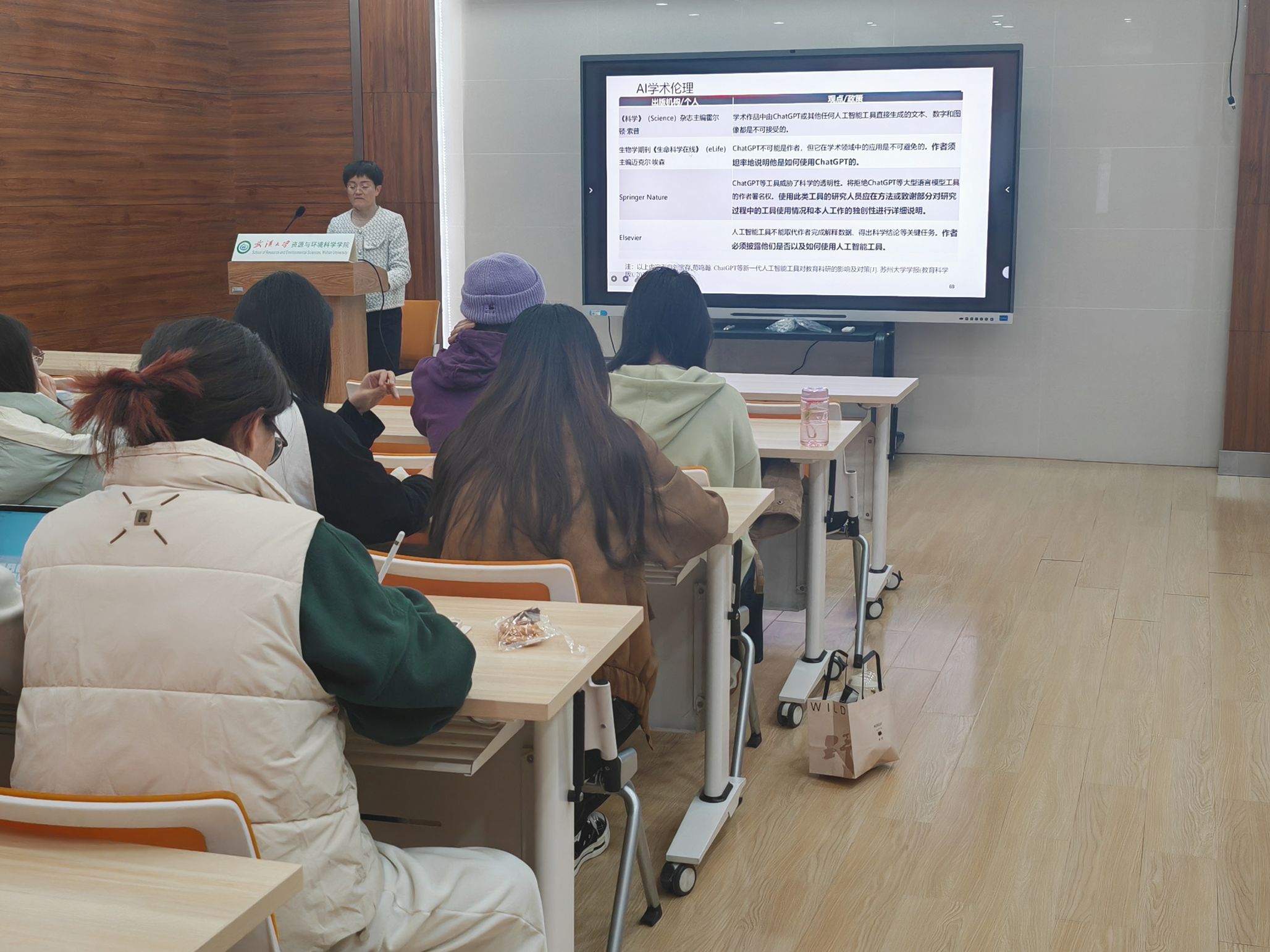 在讲座的最后,赖老师与大家一起探讨了 AI 学术伦理问题。她指出,随着人工智能技术的发展,AI 在学术研究中的应用越来越广泛,但同时也带来了一些伦理问题。同学们在使用 AI 工具时,应遵守学术道德规范,确保学术研究的公正性和真实性。