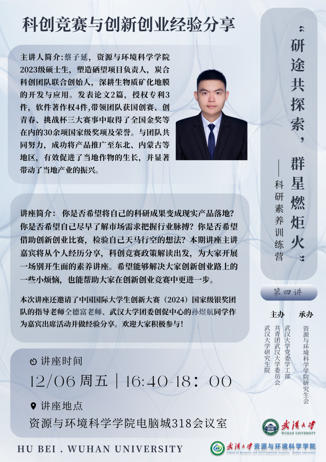 本次讲座还将邀请中国国际大学生创新大赛(2024)国家级银奖团队的指导老师仝德富老师作为嘉宾出席参与和分享。欢迎大家积极参与!