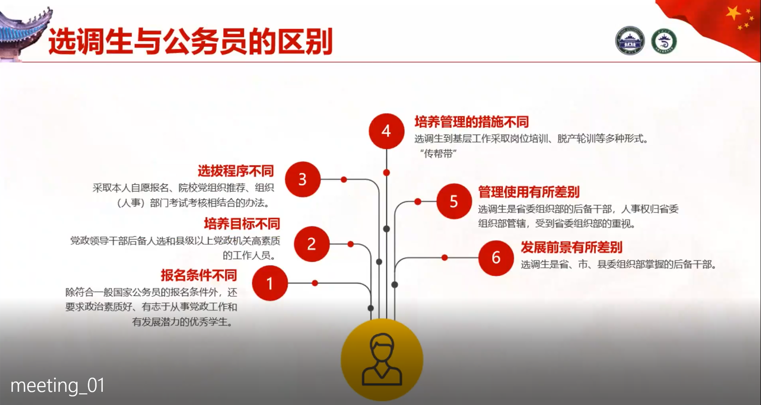 陈世明同学从背景、定义和对比等方面为切入点,介绍选调生特别是定向选调生的内涵;以江苏和浙江政策文件为例介绍各省对定向选调学历、专业及年龄的要求、选调生的选调程序、选调生的培养与分配政策等;分享真实案例以及备考经验、建议。