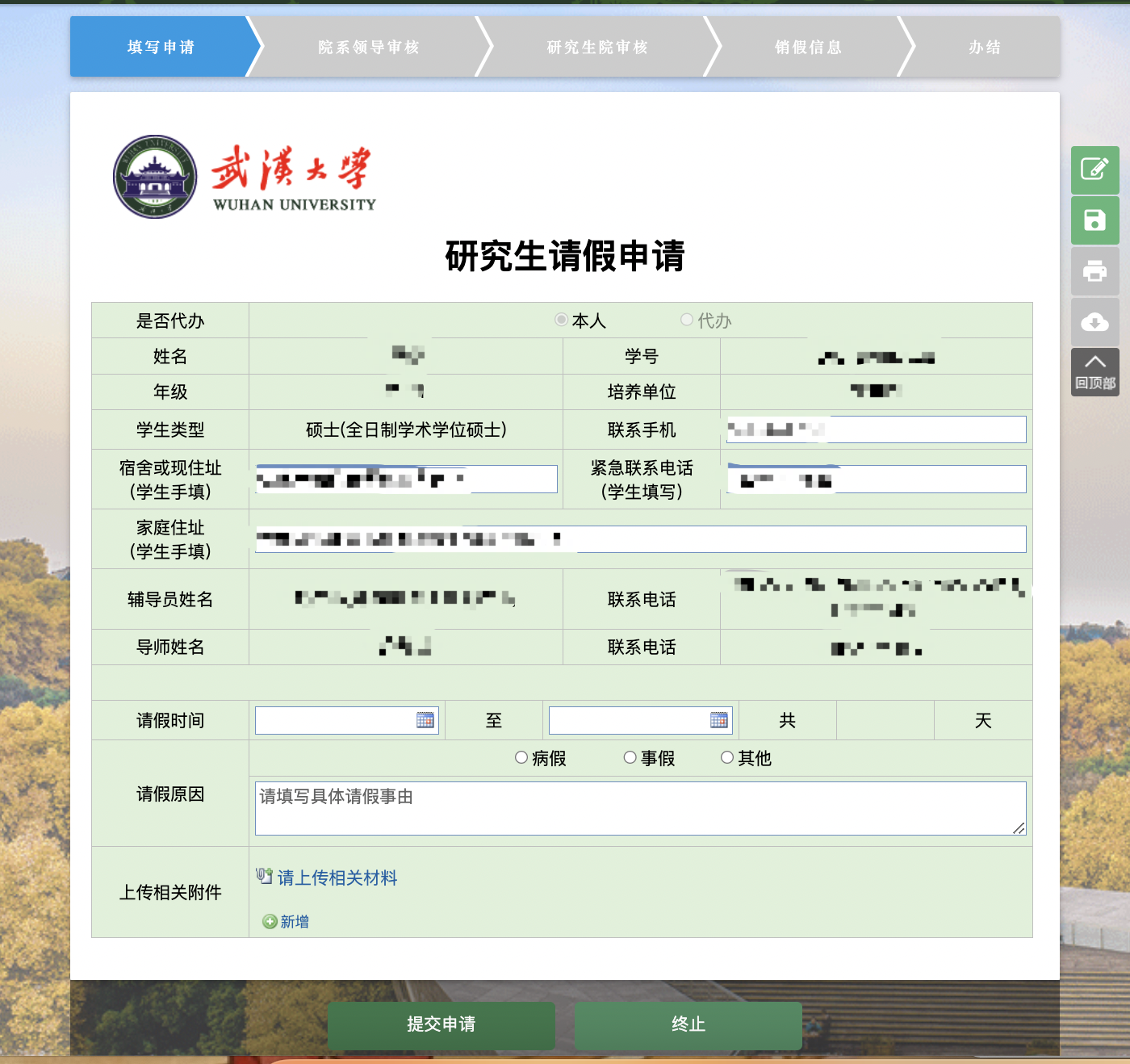 手机端:智慧珞珈APP--办事大厅--研究生请销假申请