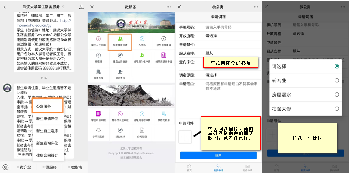 学生宿舍服务”公众号,点击“微服务”—“公寓服务”—“学生换宿申请”;