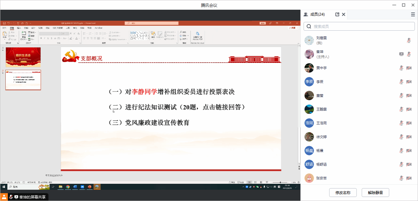 2023年9月28日晚20:00,地理信息与地图科学系研究生第六党支部组织生活会暨支部委员调整大会于腾讯会议室线上召开。会议主要议程有以下两项:一是支部支委调整,增补组织委员;二是召开组织生活会,以“加强纪律教育 培养纪律自觉”为主题,组织支部党员参加纪法知识测试,并进行党风廉政建设宣传教育。本次会议由支部书记秦坤同志主持,支部党员参与此次会议。