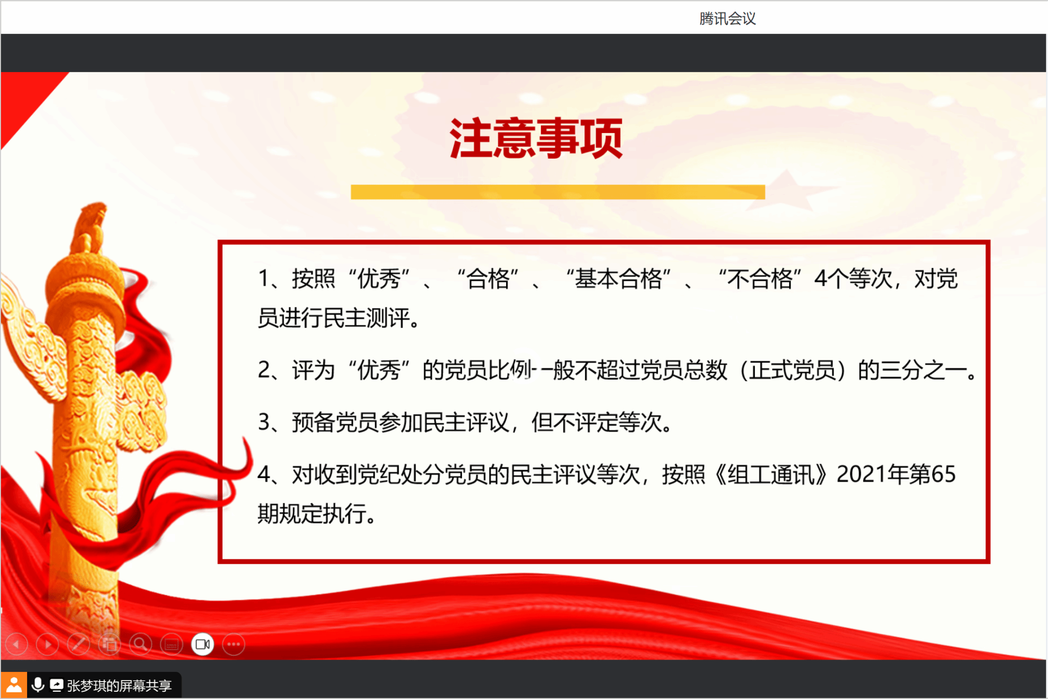2024年1月25日晚上20:30,环境科学与工程系研究生第二党支部于腾讯会议线上举行组织生活会暨民主评议会。本次会议由支部书记张梦琪同志主持,支部党员、预备党员及入党积极分子参与此次会议。本次会议应到正式党员21名,预备党员3名;实到会正式党员17名,预备党员2名。