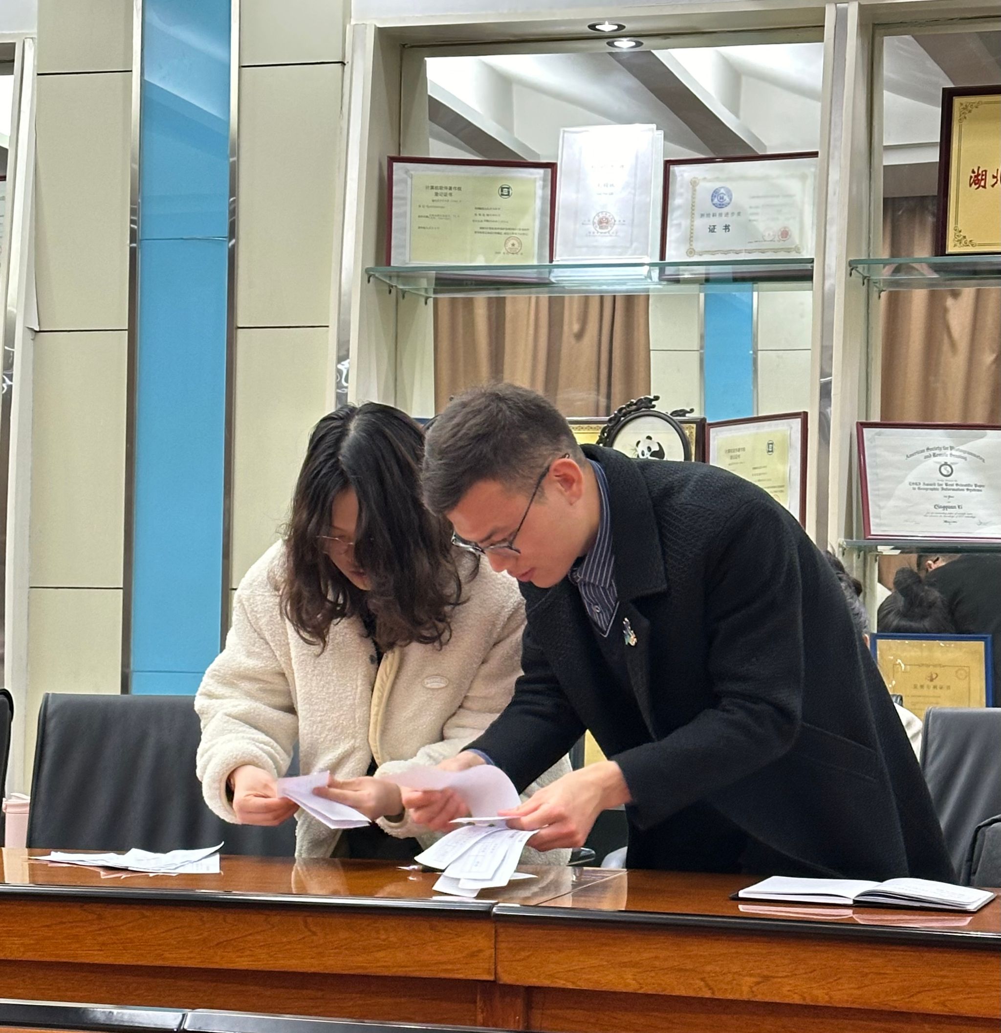 会议第五项,由监票人吴云松同志、计票人刘泽瑾同志向到场的各位正式党员发放表决票,发出表决票23张,收回表决票23张,均赞成丁怡婕同志转正,表决有效。支部书记马淼同志宣布,经支部大会无记名投票表决,对丁怡婕同志的赞成人数超过应到会有表决权的正式党员的半数,同意其按期转为中共正式党员。