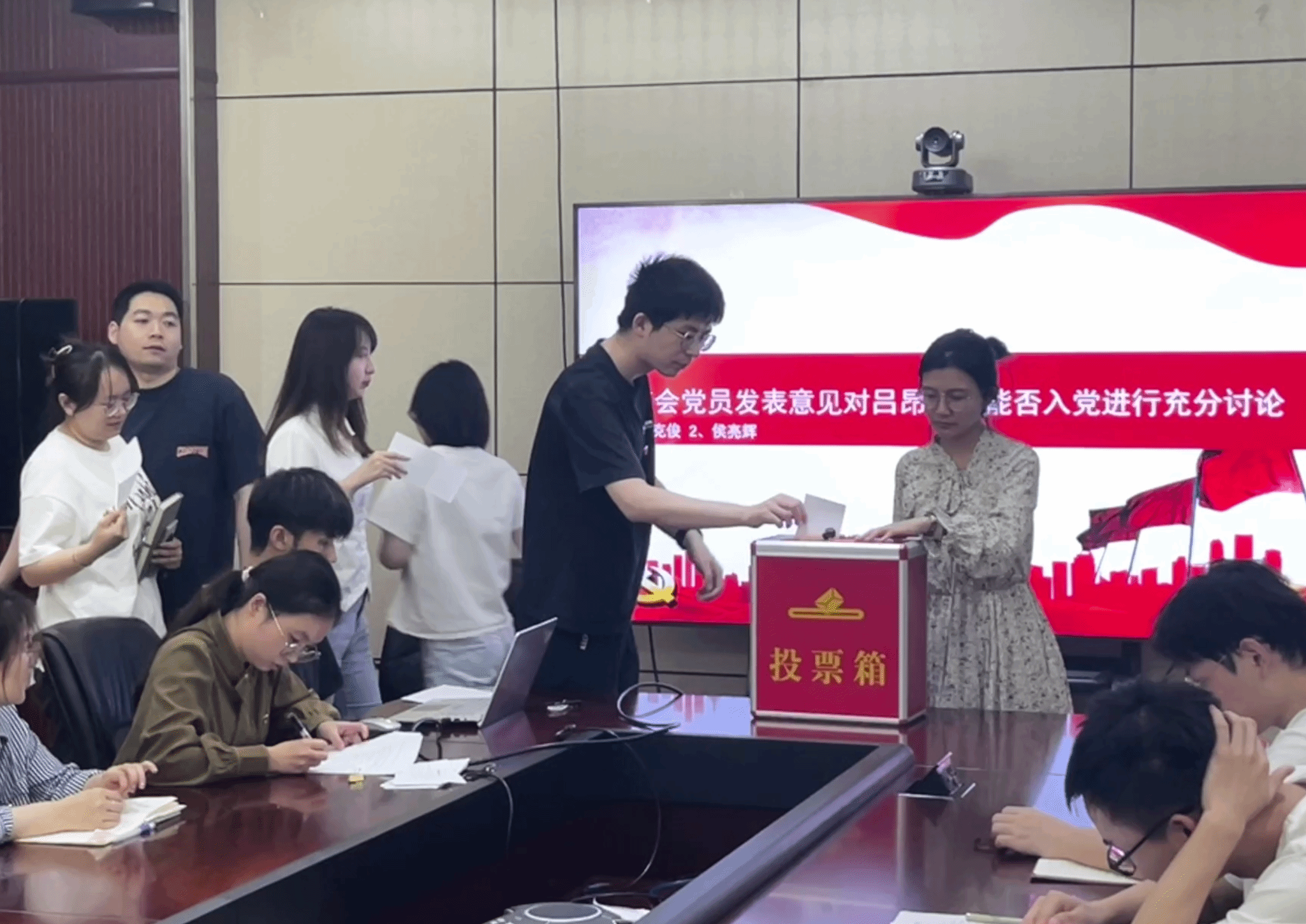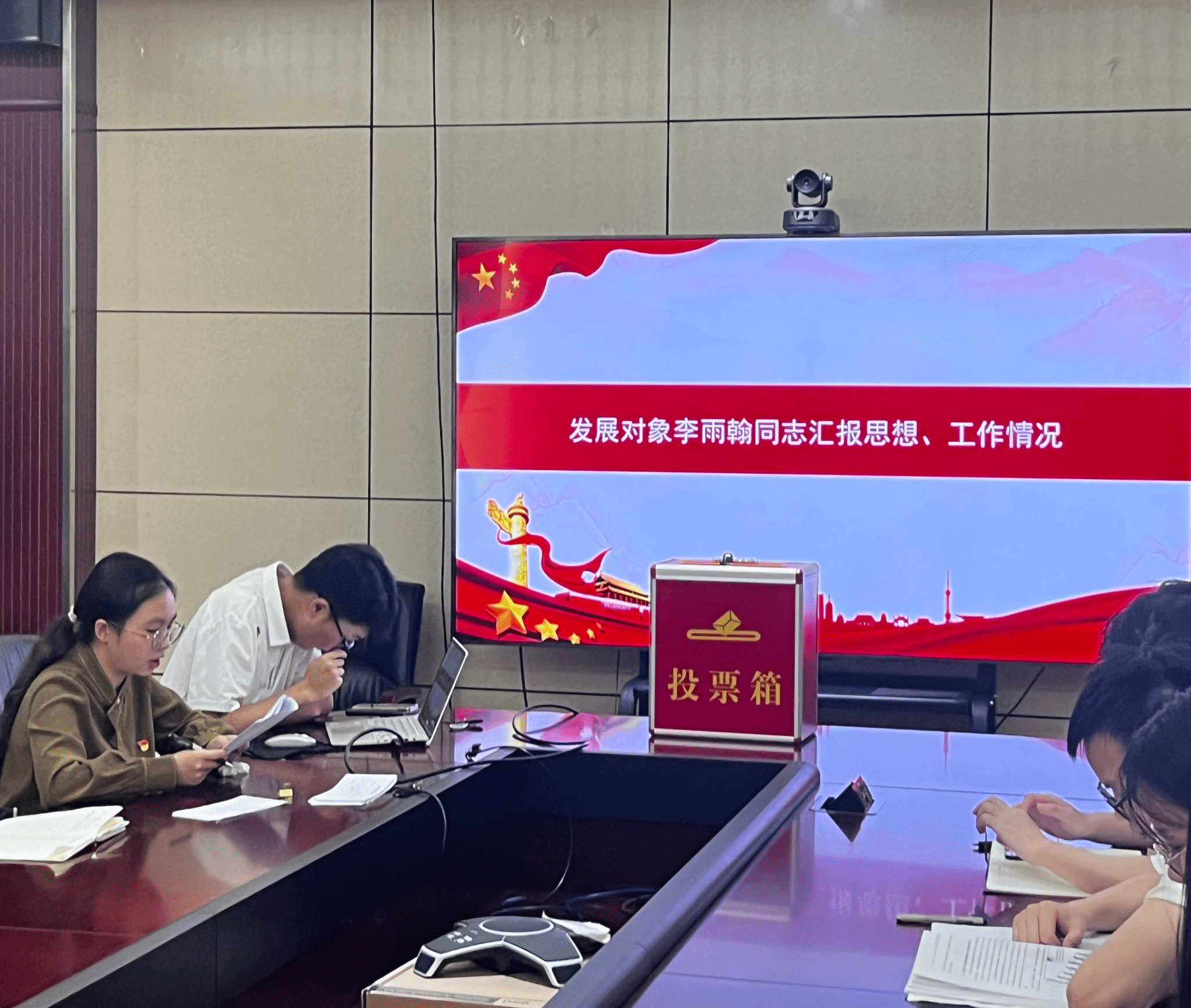 会议第二项,讨论接收李雨翰和吕昂两位同志为中共预备党员。首先,两位同志分别就自身情况、对党的认识、入党动机、申请入党历程、现实表现等向党组织进行了汇报。接下来,由入党介绍人依次介绍有关情况:两位同志均在政治思想学习和个人修养提升等方面积极向党组织靠拢,符合党员标准。刘心悦同志代表支委会报告审查情况:李雨翰和吕昂两位同志发展流程规范,政审合格,符合入党条件。紧接着,与会党员发表意见,正式党员进行无记名投票表决,同意18票,反对0票,弃权0票。由党支部书记张梦琪宣读大会决议,同意接收李雨翰和吕昂两位同志为预备党员。随后新党员同志表态,表达了时刻向党组织看齐,严格要求自我的坚定信念。