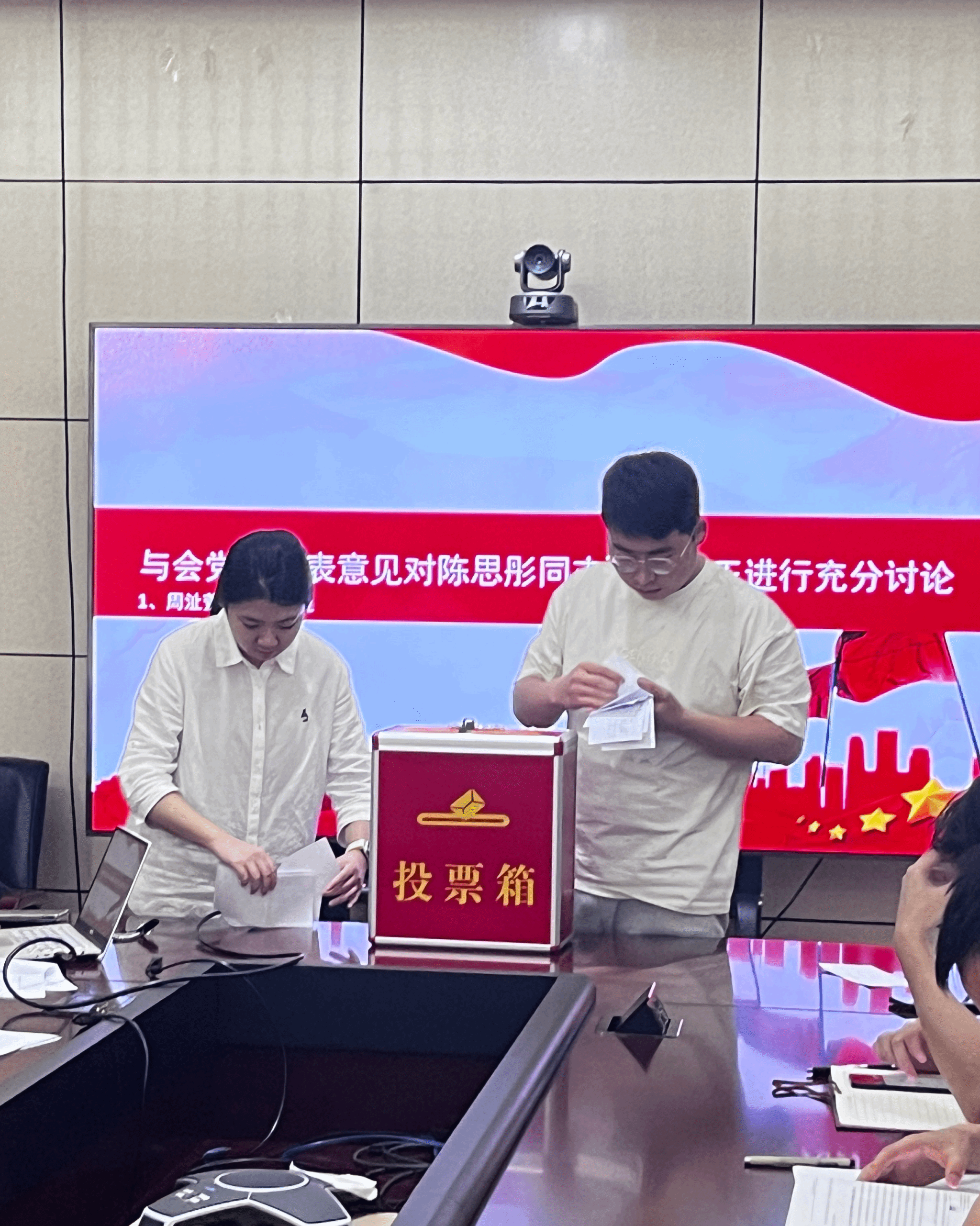 会议第一项,讨论预备党员蒋安娜和陈思彤两位同志的转正申请。首先,由蒋安娜和陈思彤两位同志分别向党支部汇报他们在预备期内的表现、本人的入党动机、介绍科研学习和生活上的表现并进行总结与反思。由培养考察人汇报考察情况,支部委员侯亮辉同志介绍支部的教育考察情况,以及与会正式党员发表意见,均对两名同志的表现给予肯定并提出不足,期望改进。随后由正式党员进行无记名投票,同意16票,反对0票,弃权0票。党支部书记张梦琪宣读大会决议,同意蒋安娜和陈思彤同志按期转为中共正式党员。