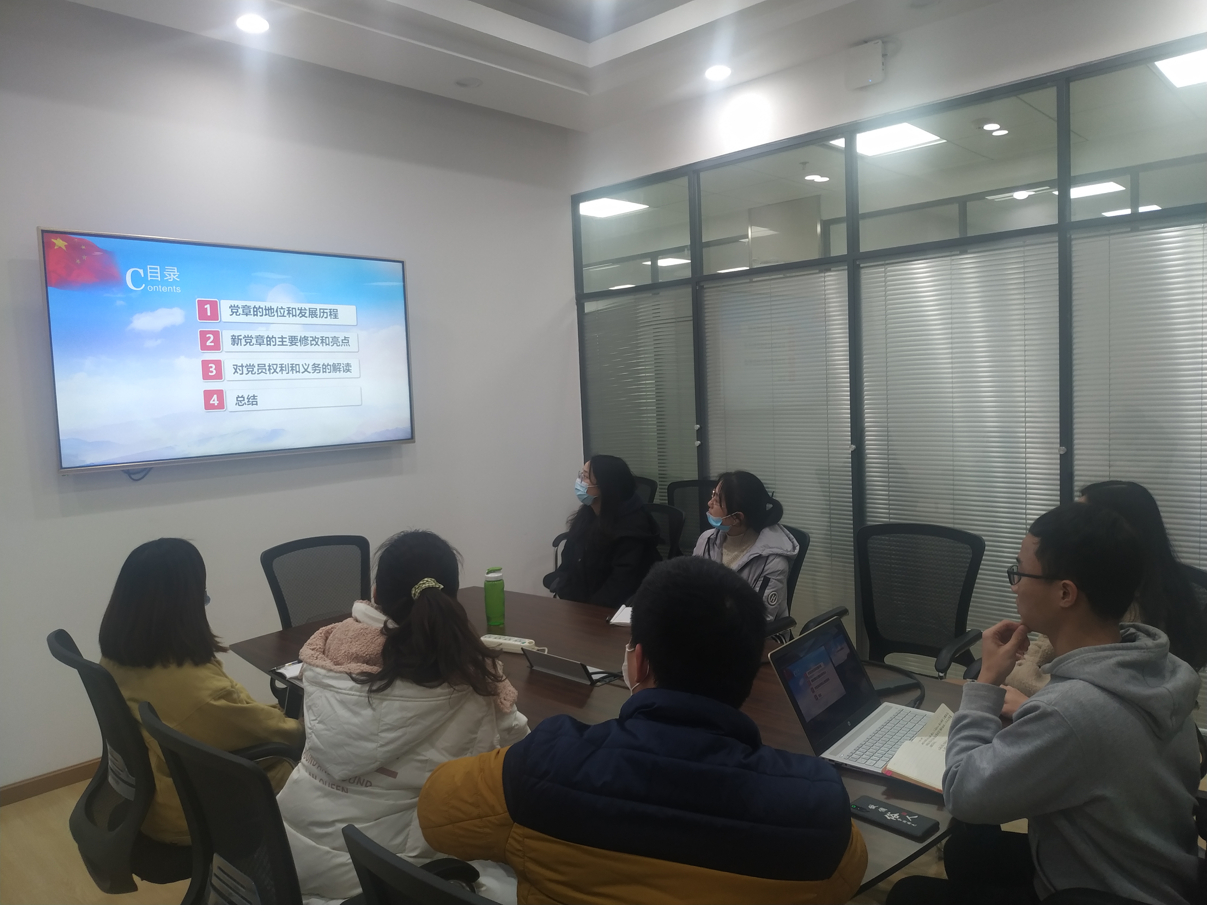 本次党日活动由宣传委员莫昭洪同志主持,主要包含以下内容:(1)介绍党章的地位和发展历程;(2)讲述新党章的主要修改和亮点;(3)观看视频,对党员权利和义务进行解读;(4)总结交流感悟。
