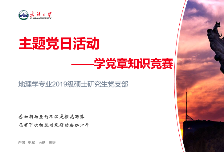 根据学校党委《关于巩固深化“不忘初心、牢记使命”主题教育成果重点任务工作方案》,党支部每年要组织1次党章专题学习交流。地理学专业2019级硕士研究生党支部于12月14日15:00在学院504会议室开展以《“不忘初心,牢记使命学党章知识竞赛”》为主题的党日活动,深入学习党章。为鼓励支部成员及群众积极参与本次活动,支部采用知识竞赛的形式,设置一等奖1名,二等奖2名,3等奖3名,优胜奖若干并颁发奖品。